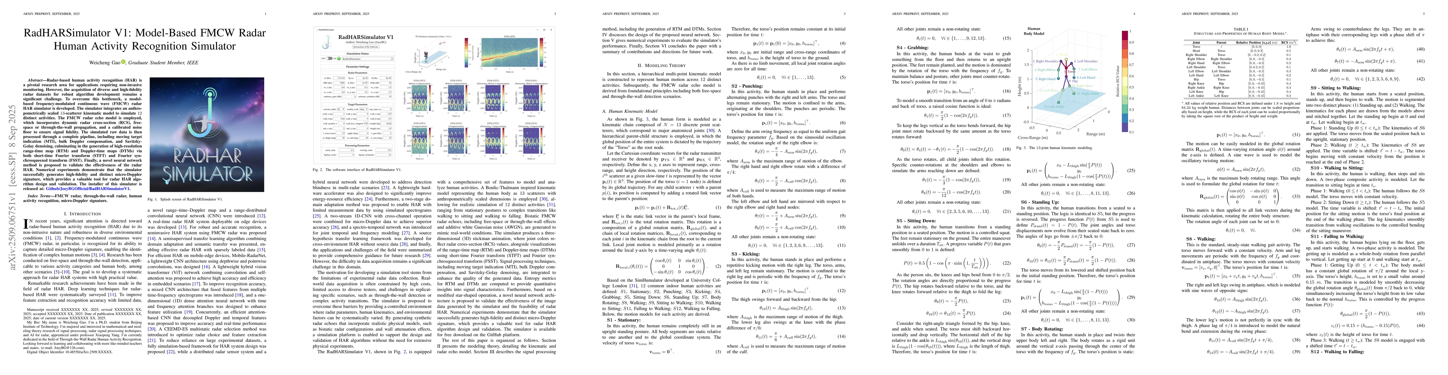 Radar-based human activity recognition (HAR) is a pivotal research area for applications requiring non-invasive monitoring. However, the acquisition of diverse and high-fidelity radar datasets for robust algorithm development remains a significant challenge. To overcome this bottleneck, a model-based frequency-modulated continuous wave (FMCW) radar HAR simulator is developed. The simulator integrates an anthropometrically scaled $13$-scatterer kinematic model to simulate $12$ distinct activities. The FMCW radar echo model is employed, which incorporates dynamic radar cross-section (RCS), free-space or through-the-wall propagation, and a calibrated noise floor to ensure signal fidelity. The simulated raw data is then processed through a complete pipeline, including moving target indication (MTI), bulk Doppler compensation, and Savitzky-Golay denoising, culminating in the generation of high-resolution range-time map (RTM) and Doppler-time maps (DTMs) via both short-time Fourier transform (STFT) and Fourier synchrosqueezed transform (FSST). Finally, a novel neural network method is proposed to validate the effectiveness of the radar HAR. Numerical experiments demonstrate that the simulator successfully generates high-fidelity and distinct micro-Doppler signature, which provides a valuable tool for radar HAR algorithm design and validation. The installer of this simulator is released at: \href{https://github.com/JoeyBGOfficial/RadHARSimulatorV1-Model-Based-FMCW-Radar-Human-Activity-Recognition-Simulator}{Github/JoeyBGOfficial/RadHARSimulatorV1}.