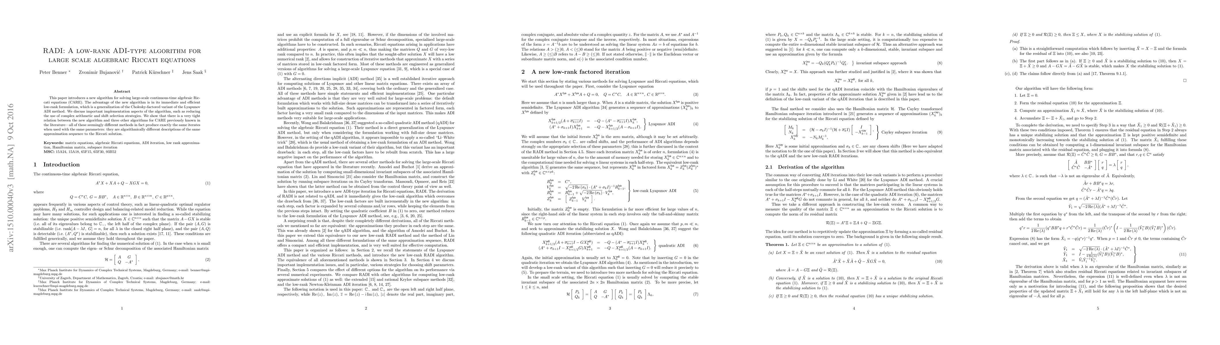 This paper presents RADI, a low-rank ADI-type algorithm for solving large-scale algebraic Riccati equations, emphasizing its efficient and generalized low-rank formulation. The study also reveals that RADI is algorithmically equivalent to three previously known methods, despite their different descriptions.