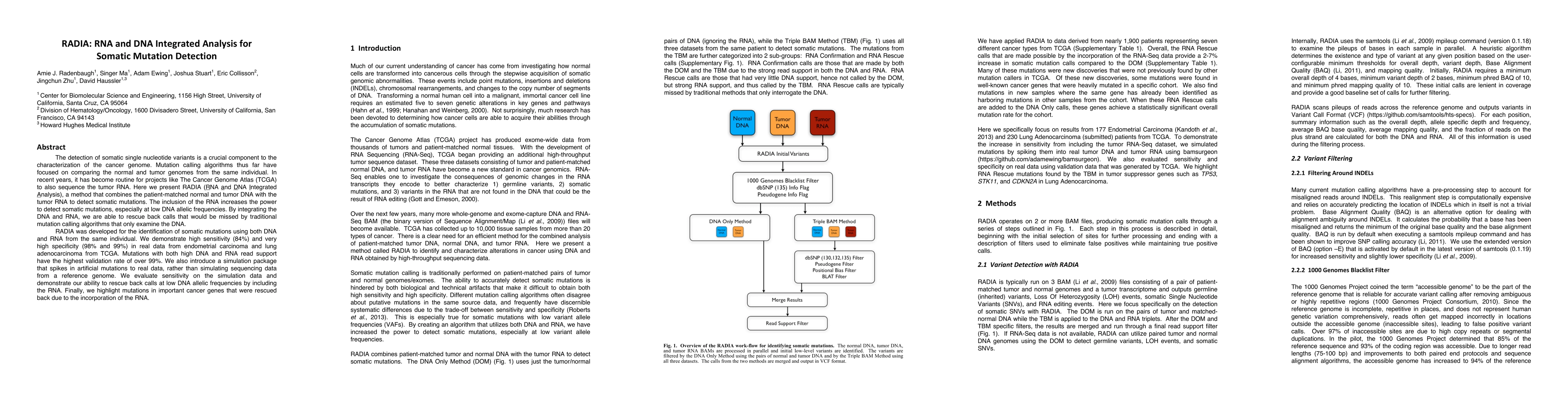 RADIA is a novel method for detecting somatic mutations by integrating patient-matched normal and tumor DNA with tumor RNA, enhancing detection power, especially at low DNA allelic frequencies. It demonstrates high sensitivity and specificity in real data from TCGA studies, rescuing missed calls from traditional DNA-only methods.