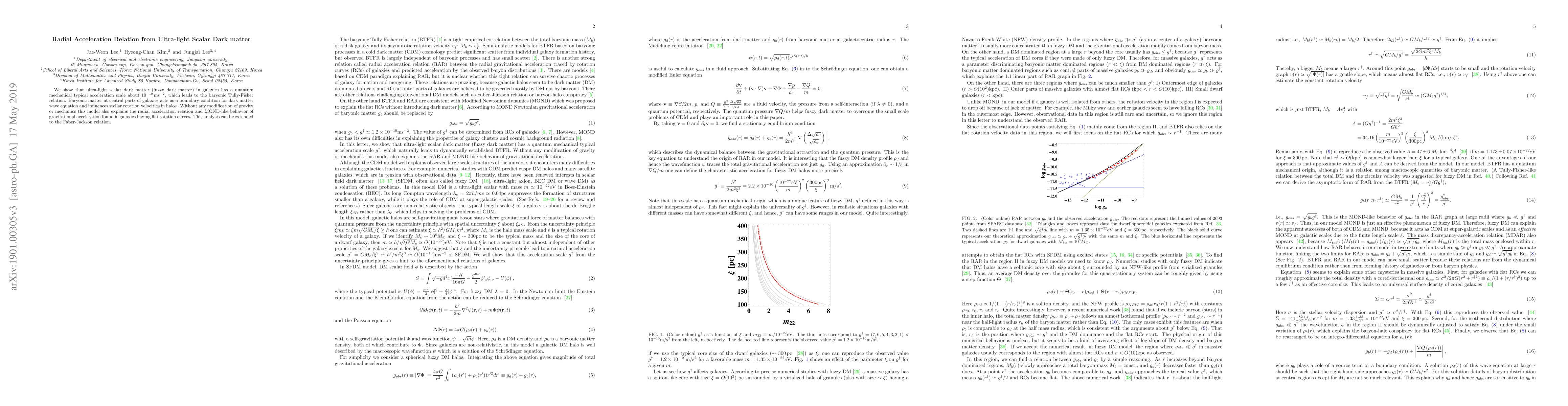 This paper demonstrates that ultra-light scalar dark matter creates a quantum mechanical acceleration scale of $10^{-10}\,\mbox{ms}^{-2}$, explaining the radial acceleration relation and MOND-like behavior without altering gravity, thus linking it to the Tully-Fisher relation and potentially the Faber-Jackson relation.