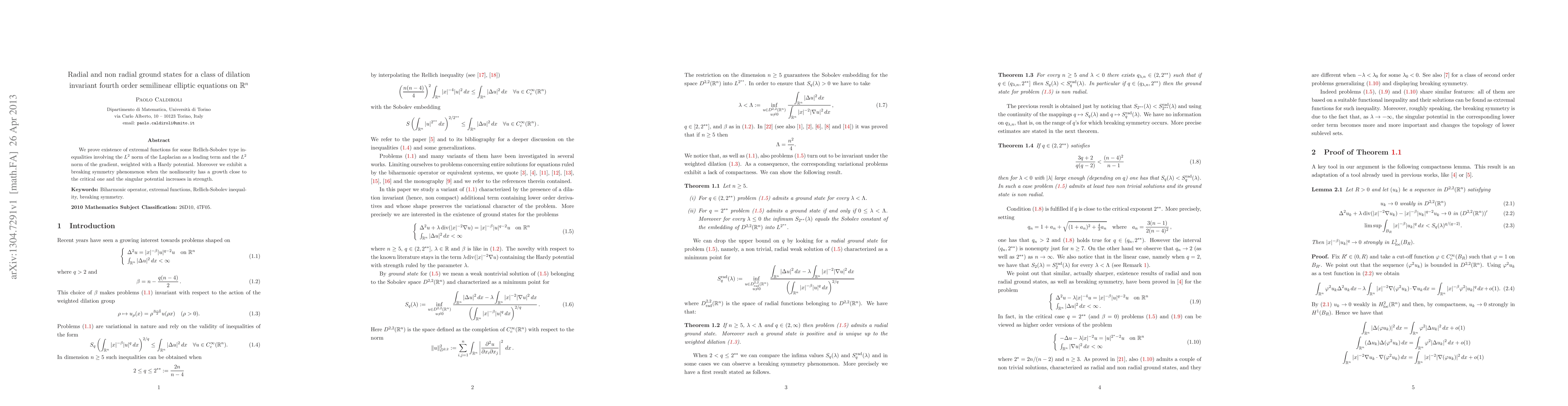 We prove existence of extremal functions for some Rellich-Sobolev type inequalities involving the $L^{2}$ norm of the Laplacian as a leading term and the $L^{2}$ norm of the gradient, weighted with a Hardy potential. Moreover we exhibit a breaking symmetry phenomenon when the nonlinearity has a growth close to the critical one and the singular potential increases in strength.