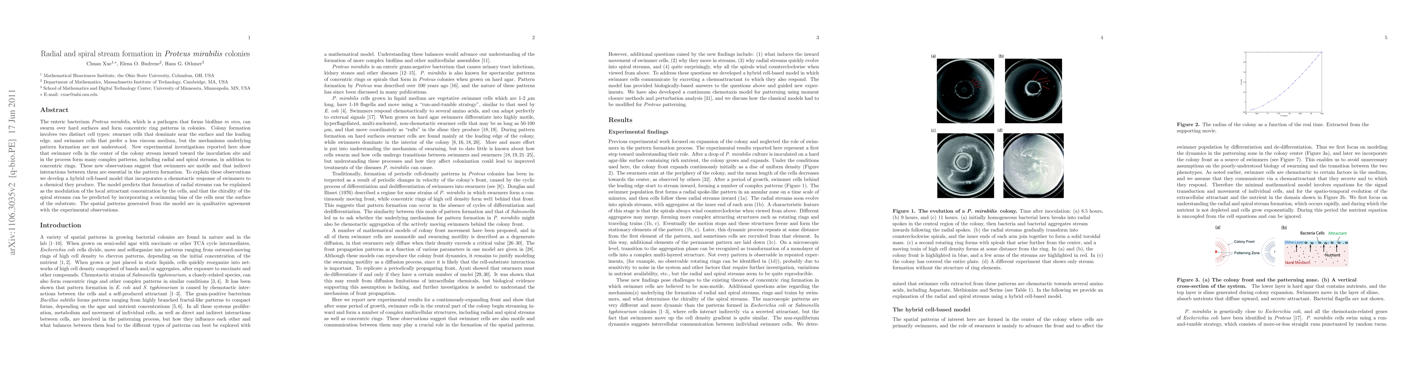 The enteric bacterium Proteus mirabilis, which is a pathogen that forms biofilms in vivo, can swarm over hard surfaces and form concentric ring patterns in colonies. Colony formation involves two distinct cell types: swarmer cells that dominate near the surface and the leading edge, and swimmer cells that prefer a less viscous medium, but the mechanisms underlying pattern formation are not understood. New experimental investigations reported here show that swimmer cells in the center of the colony stream inward toward the inoculation site and in the process form many complex patterns, including radial and spiral streams, in addition to concentric rings. These new observations suggest that swimmers are motile and that indirect interactions between them are essential in the pattern formation. To explain these observations we develop a hybrid cell-based model that incorporates a chemotactic response of swimmers to a chemical they produce. The model predicts that formation of radial streams can be explained as the modulation of the local attractant concentration by the cells, and that the chirality of the spiral streams can be predicted by incorporating a swimming bias of the cells near the surface of the substrate. The spatial patterns generated from the model are in qualitative agreement with the experimental observations.