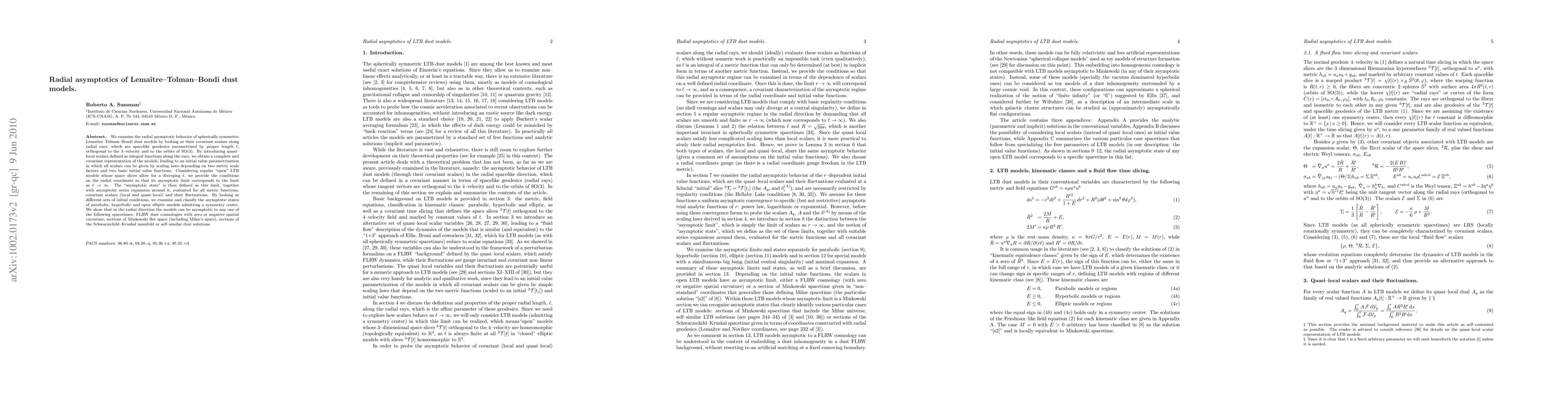 This paper investigates the radial asymptotic behavior of spherically symmetric Lemaitre-Tolman-Bondi dust models, defining quasi-local scalars along radial geodesics and providing a covariant representation. It classifies the asymptotic states of various models, showing that they can asymptotically resemble FLRW cosmologies, Minkowski space, Schwarzschild-Kruskal sections, or self-similar dust solutions.