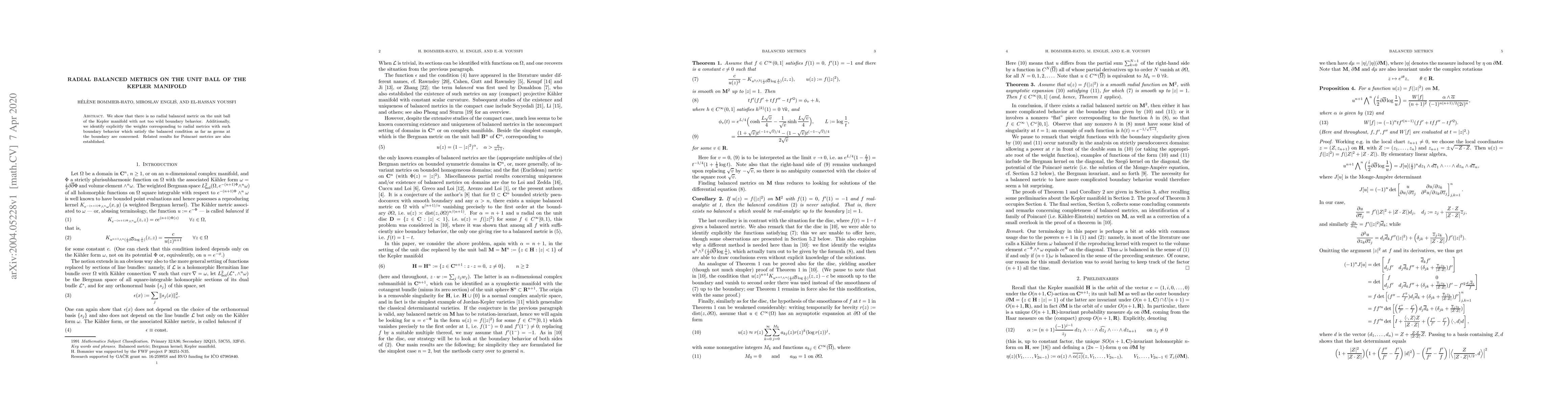 We show that there is no radial balanced metric on the unit ball of the Kepler manifold with not too wild boundary behavior. Additionally, we identify explicitly the weights corresponding to radial metrics with such boundary behavior which satisfy the balanced condition as far as germs at the boundary are concerned. Related results for Poincare metrics are also established.