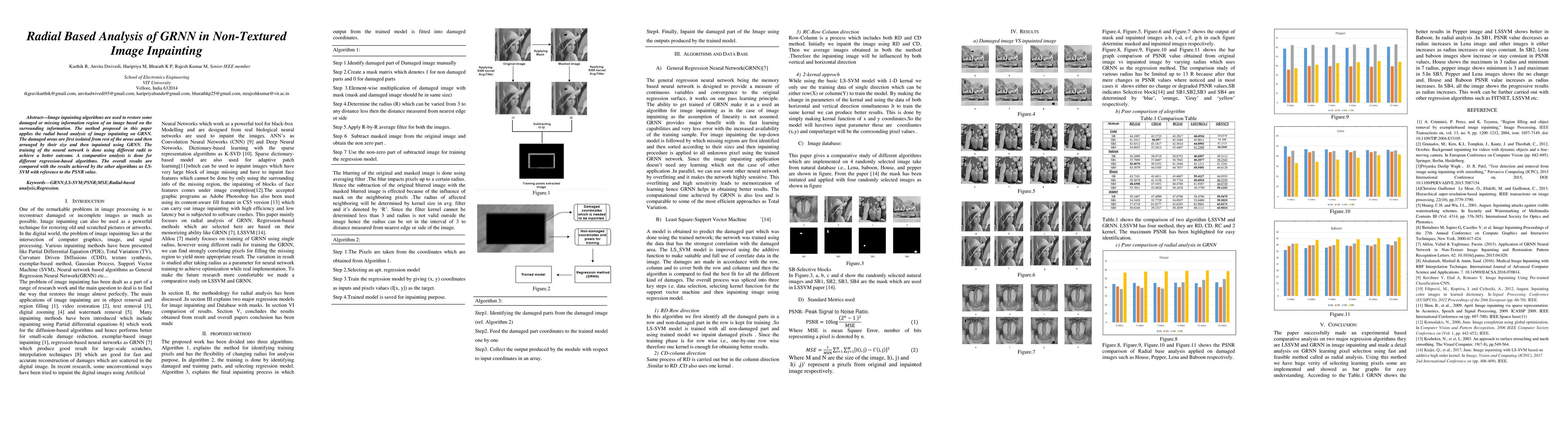 The paper proposes a radial-based analysis for GRNN in non-textured image inpainting. It involves isolating damaged areas, arranging them by size, and inpainting using GRNN. The neural network is trained with varying radii for better outcomes, and a comparative analysis is done with other regression-based algorithms, including LS-SVM, based on PSNR values.