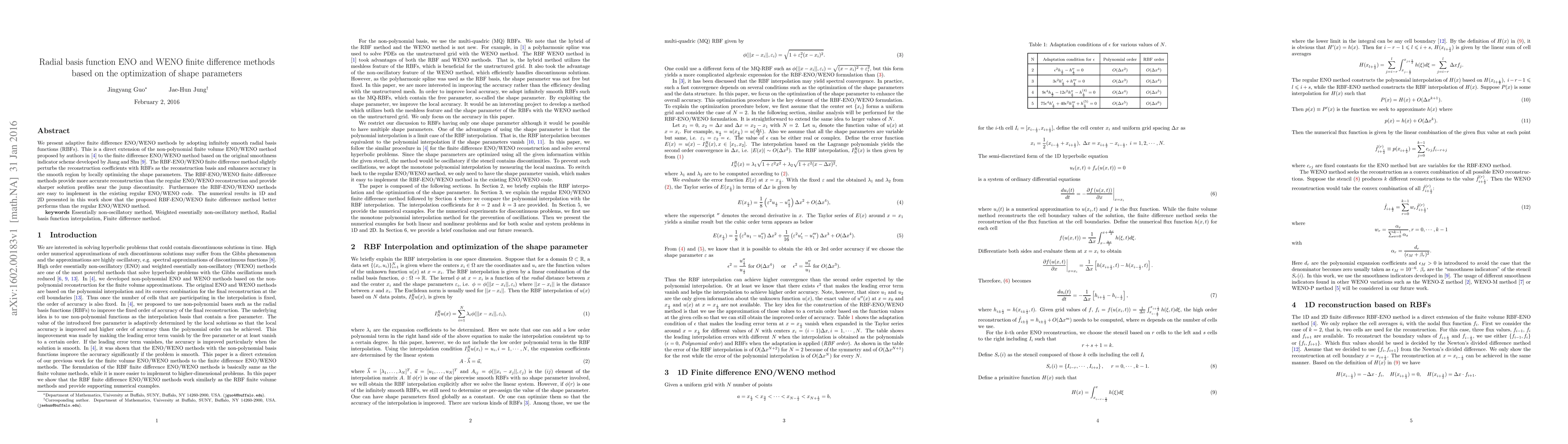 This paper introduces adaptive finite difference ENO/WENO methods using radial basis functions to optimize shape parameters, enhancing accuracy and solution profiles near discontinuities. The proposed RBF-ENO/WENO methods outperform regular ENO/WENO methods in numerical tests.