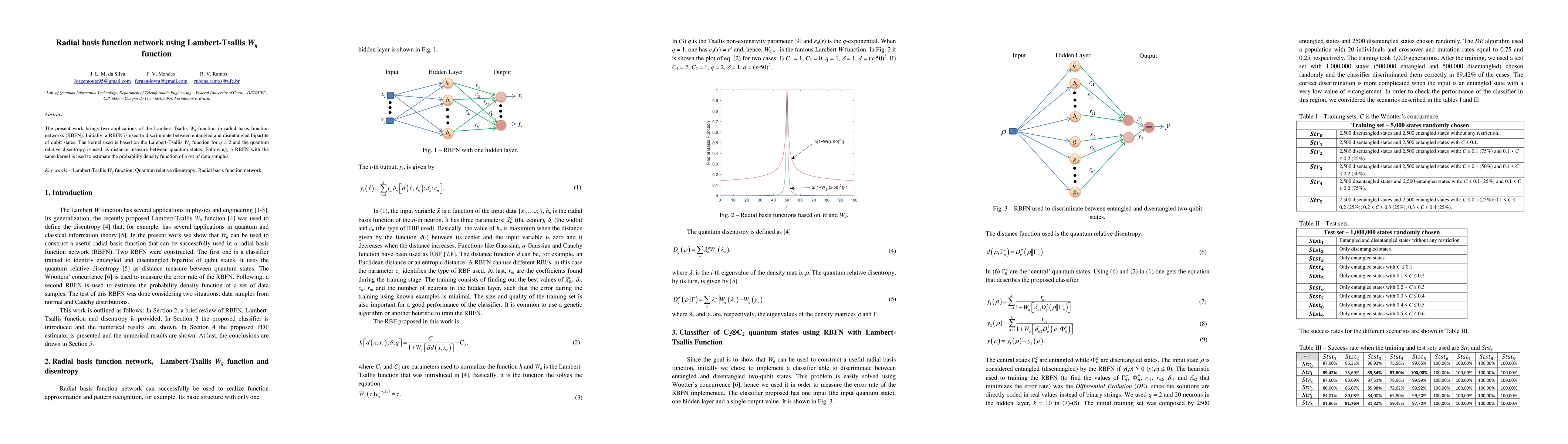 This paper applies the Lambert-Tsallis Wq function in radial basis function networks (RBFN) to discriminate entangled and disentangled qubit states using quantum relative disentropy. It also employs the same RBFN kernel to estimate the probability density function of data samples.