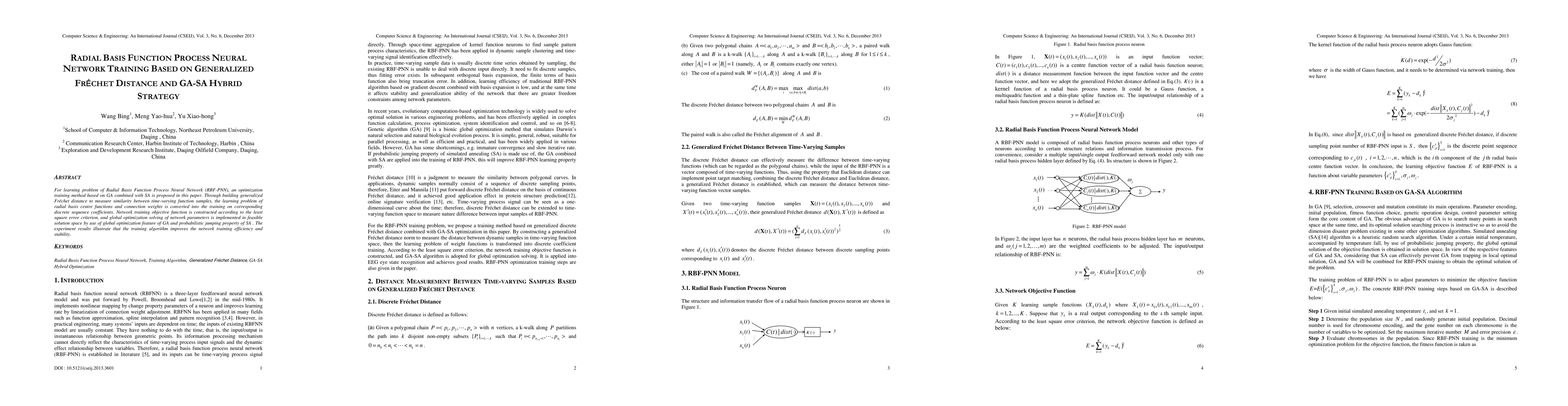 This paper proposes a hybrid GA-SA optimization training method for Radial Basis Function Process Neural Networks (RBF-PNN), utilizing generalized Fréchet distance to measure function similarity and converting the learning problem into a discrete sequence coefficient training. The method enhances network training efficiency and stability.