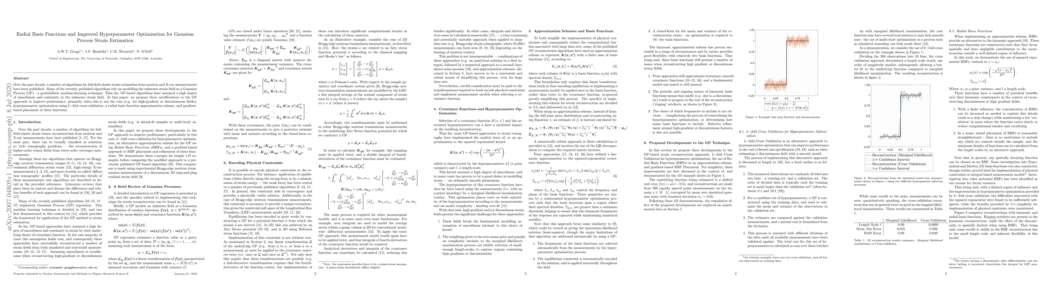 This paper proposes enhancements to Gaussian Process (GP) algorithms for strain estimation, including improved hyperparameter optimisation, a radial basis function approximation, and gradient-based placement of basis functions to better handle high-gradient or discontinuous strain fields. The modifications aim to improve the accuracy and performance of GP-based strain estimation methods.