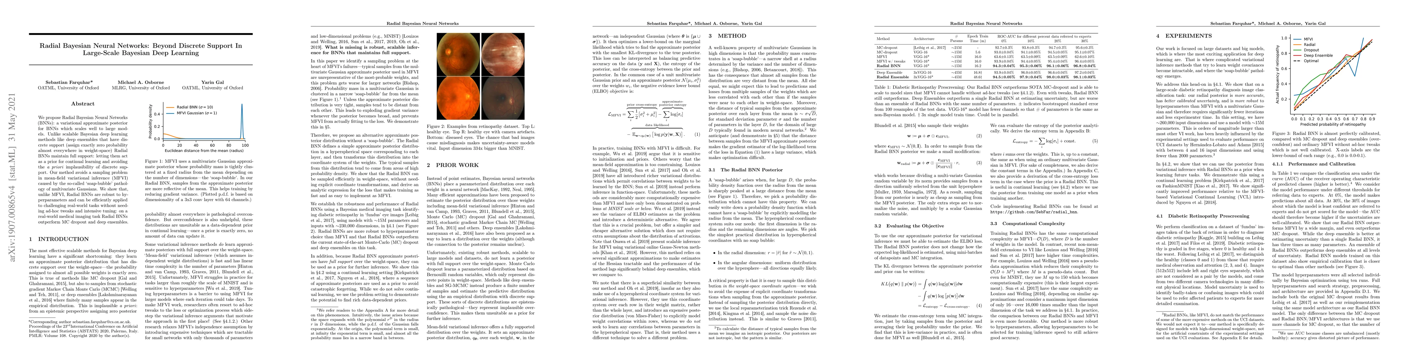 This paper introduces Radial Bayesian Neural Networks (BNNs) as a scalable variational approach for large-scale Bayesian deep learning, offering full support over weight-space unlike discrete support methods. The Radial BNNs are shown to outperform discrete methods in real-world applications and enable robust Bayesian continual learning.