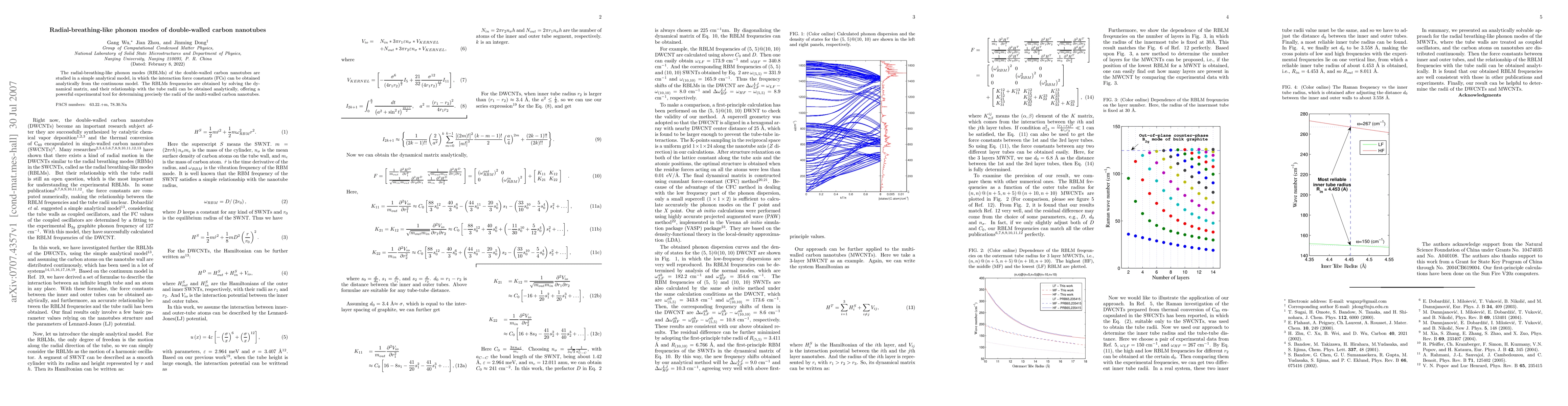 This research develops an analytical model to study radial-breathing-like phonon modes (RBLMs) in double-walled carbon nanotubes, deriving interaction force constants and solving for RBLM frequencies. This provides an accurate method for determining the radii of multi-walled carbon nanotubes experimentally.