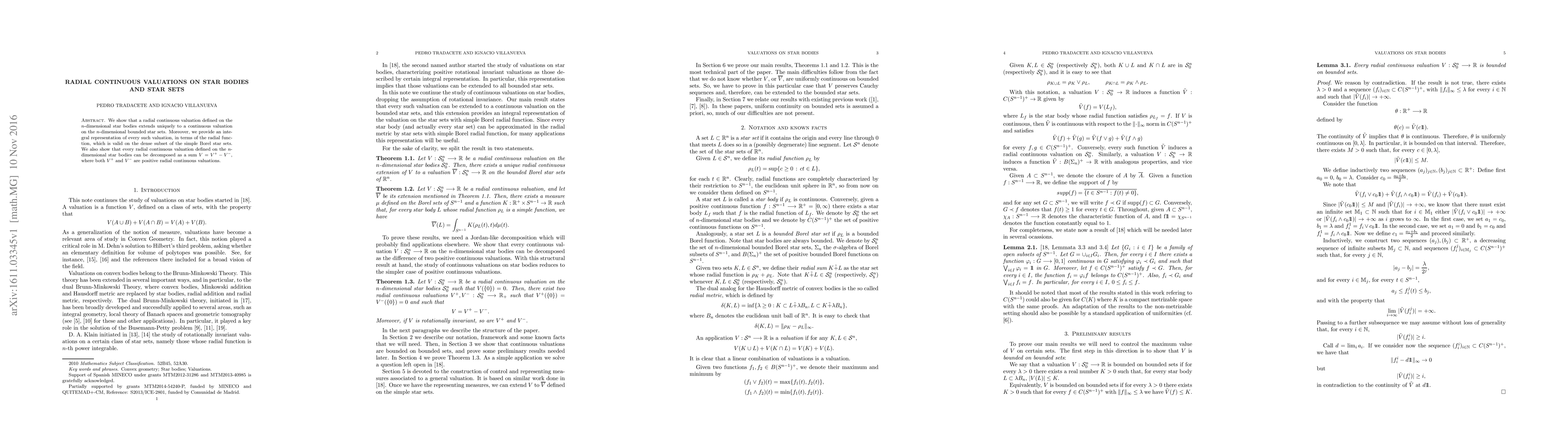 We show that a radial continuous valuation defined on the $n$-dimensional star bodies extends uniquely to a continuous valuation on the $n$-dimensional bounded star sets. Moreover, we provide an integral representation of every such valuation, in terms of the radial function, which is valid on the dense subset of the simple Borel star sets. We also show that every radial continuous valuation defined on the $n$-dimensional star bodies can be decomposed as a sum $V=V^+-V^-$, where both $V^+$ and $V^-$ are positive radial continuous valuations.