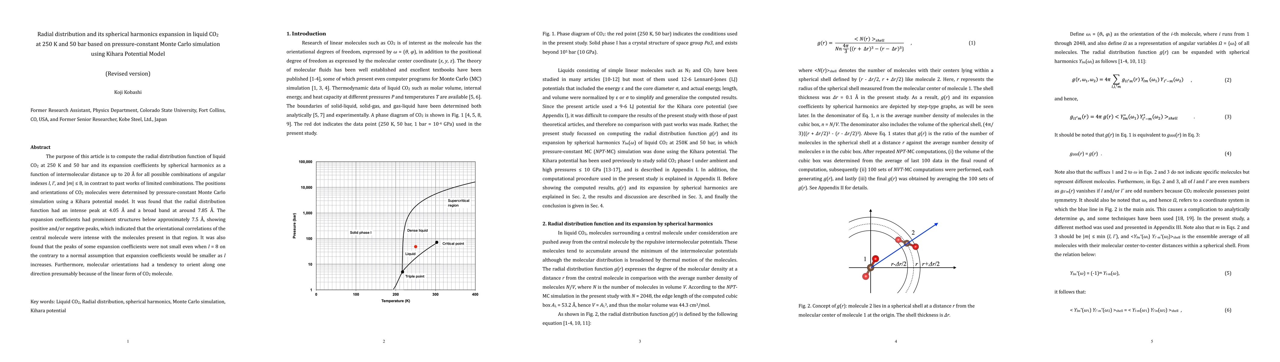 This study calculates the radial distribution function and spherical harmonics expansion coefficients for liquid CO2 at 250 K and 50 bar, revealing intense peaks in radial distribution and significant orientational correlations up to 7.5 angstroms. The results suggest further investigation into the implications of the expansion coefficients.