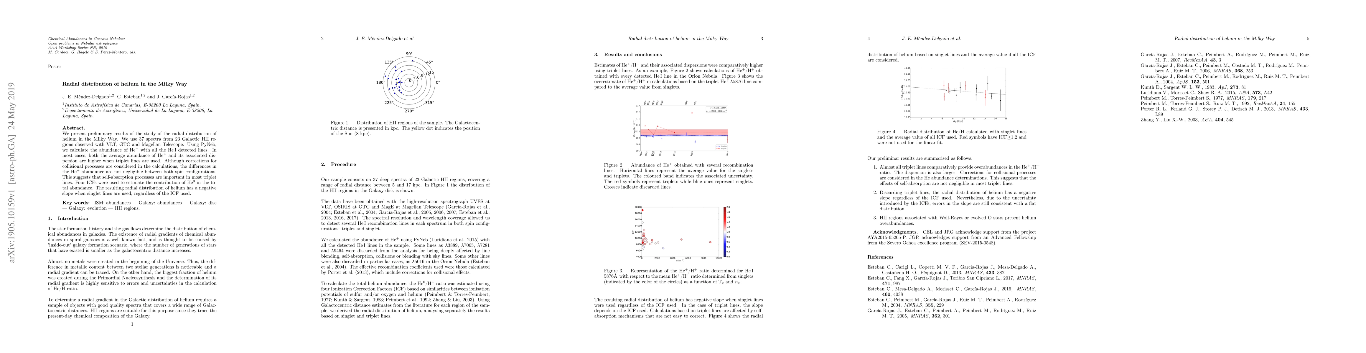 We present preliminary results of the study of the radial distribution of helium in the Milky Way. We use 37 spectra from 23 Galactic HII regions observed with VLT, GTC and Magellan Telescope. Using PyNeb, we calculate the abundance of He$^+$ with all the He$\thinspace$I detected lines. In most cases, both the average abundance of He$^+$ and its associated dispersion are higher when triplet lines are used. Although corrections for collisional processes are considered in the calculations, the differences in the He$^+$ abundance are not negligible between both spin configurations. This suggests that self-absorption processes are important in most triplet lines. Four ICFs were used to estimate the contribution of He$^0$ in the total abundance. The resulting radial distribution of helium has a negative slope when singlet lines are used, regardless of the ICF used.