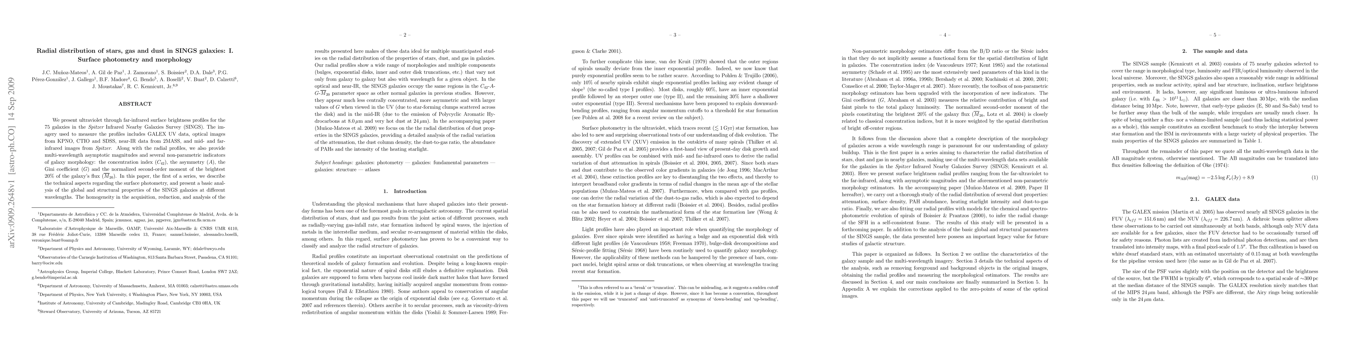 We present ultraviolet through far-infrared surface brightness profiles for the 75 galaxies in the Spitzer Infrared Nearby Galaxies Survey (SINGS). The imagery used to measure the profiles includes GALEX UV data, optical images from KPNO, CTIO and SDSS, near-IR data from 2MASS, and mid- and far-infrared images from Spitzer. Along with the radial profiles, we also provide multi-wavelength asymptotic magnitudes and several non-parametric indicators of galaxy morphology: the concentration index (C_42), the asymmetry (A), the Gini coefficient (G) and the normalized second-order moment of the brightest 20% of the galaxy's flux (M_20). Our radial profiles show a wide range of morphologies and multiple components (bulges, exponential disks, inner and outer disk truncations, etc.) that vary not only from galaxy to galaxy but also with wavelength for a given object. In the optical and near-IR, the SINGS galaxies occupy the same regions in the C_42-A-G-M_20 parameter space as other normal galaxies in previous studies. However, they appear much less centrally concentrated, more asymmetric and with larger values of G when viewed in the UV (due to star-forming clumps scattered across the disk) and in the mid-IR (due to the emission of Polycyclic Aromatic Hydrocarbons at 8.0 microns and very hot dust at 24 microns).