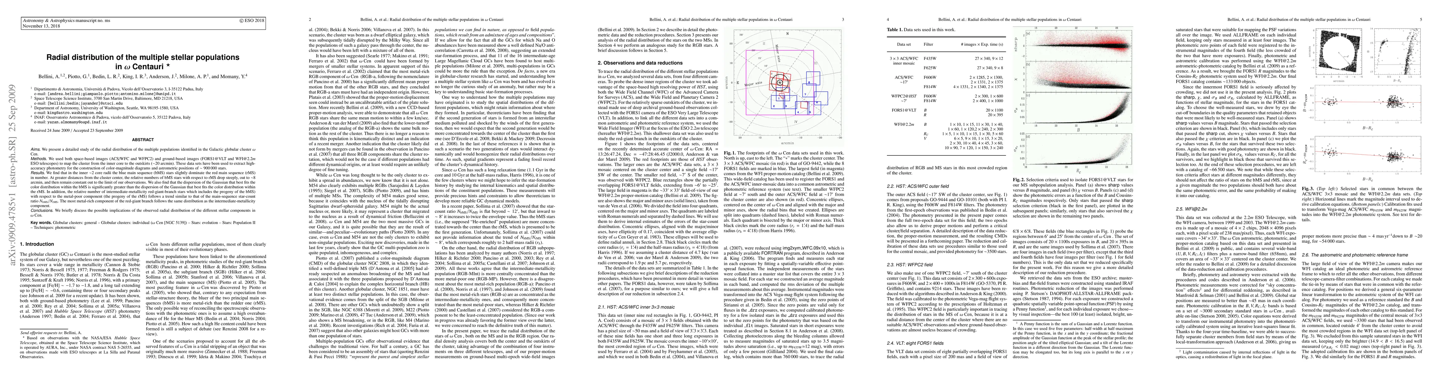 A study of the Galactic globular cluster omega Cen found a radial distribution of multiple stellar populations, with blue main-sequence stars dominating red main-sequence stars at close distances from the center, before dropping off sharply beyond 8 arcmin.