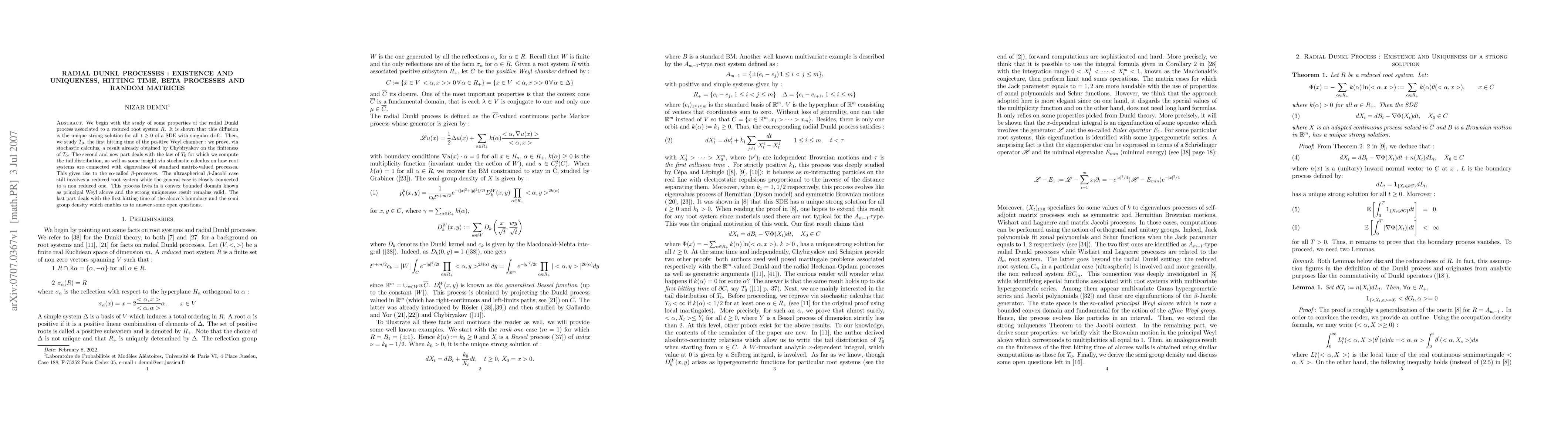 We begin with the study of some properties of the radial Dunkl process associated to a reduced root system $R$. It is shown that this diffusion is the unique strong solution for all $t \geq 0$ of a SDE with singular drift. Then, we study $T_0$, the first hitting time of the positive Weyl chamber : we prove, via stochastic calculus, a result already obtained by Chybiryakov on the finiteness of $T_0$. The second and new part deals with the law of $T_0$ for which we compute the tail distribution, as well as some insight via stochastic calculus on how root systems are connected with eigenvalues of standard matrix-valued processes. This gives rise to the so-called $\beta$-processes. The ultraspherical $\beta$-Jacobi case still involves a reduced root system while the general case is closely connected to a non reduced one. This process lives in a convex bounded domain known as principal Weyl alcove and the strong uniqueness result remains valid. The last part deals with the first hitting time of the alcove's boundary and the semi group density which enables us to answer some open questions.