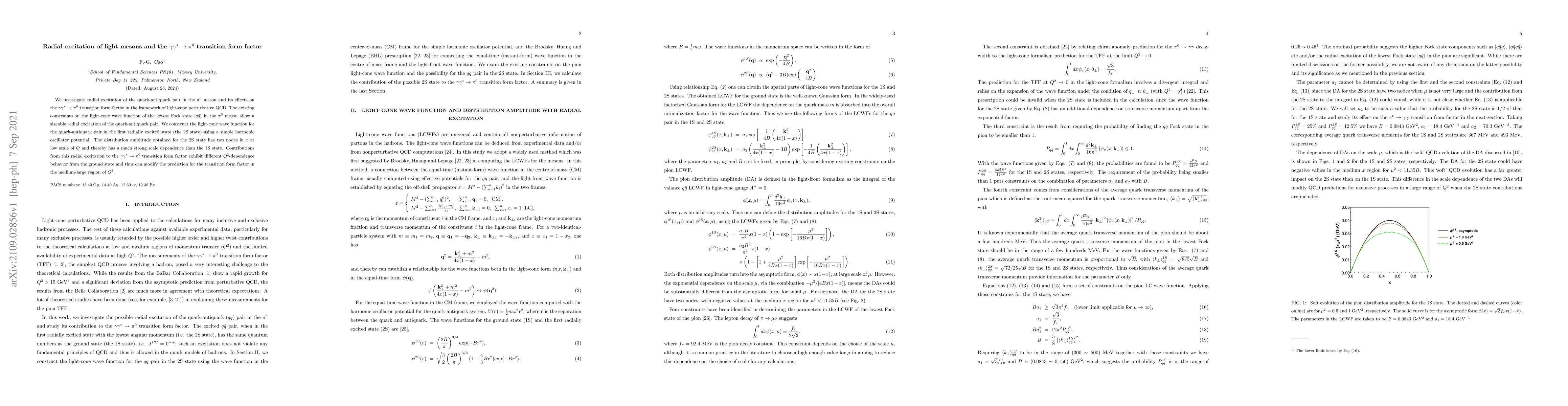 This paper explores the impact of radial excitations in the quark-antiquark pair of the $\pi^0$ meson on the $\gamma \gamma^* \rightarrow \pi^0$ transition form factor using light-cone perturbative QCD. It constructs the light-cone wave function for the first radially excited state, revealing a distinct $Q^2$-dependence that modifies predictions for the transition form factor.