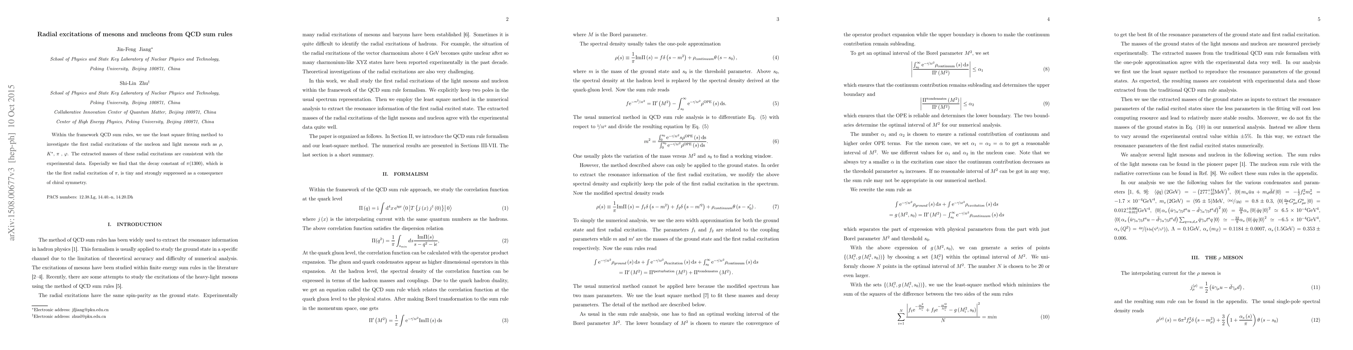 Summary: This study employs QCD sum rules and least square fitting to determine the masses of the first radial excitations of nucleons and light mesons, finding consistency with experimental data. Notably, the decay constant of the first radial excitation of pion ($\pi(1300)$) is significantly suppressed due to chiral symmetry.