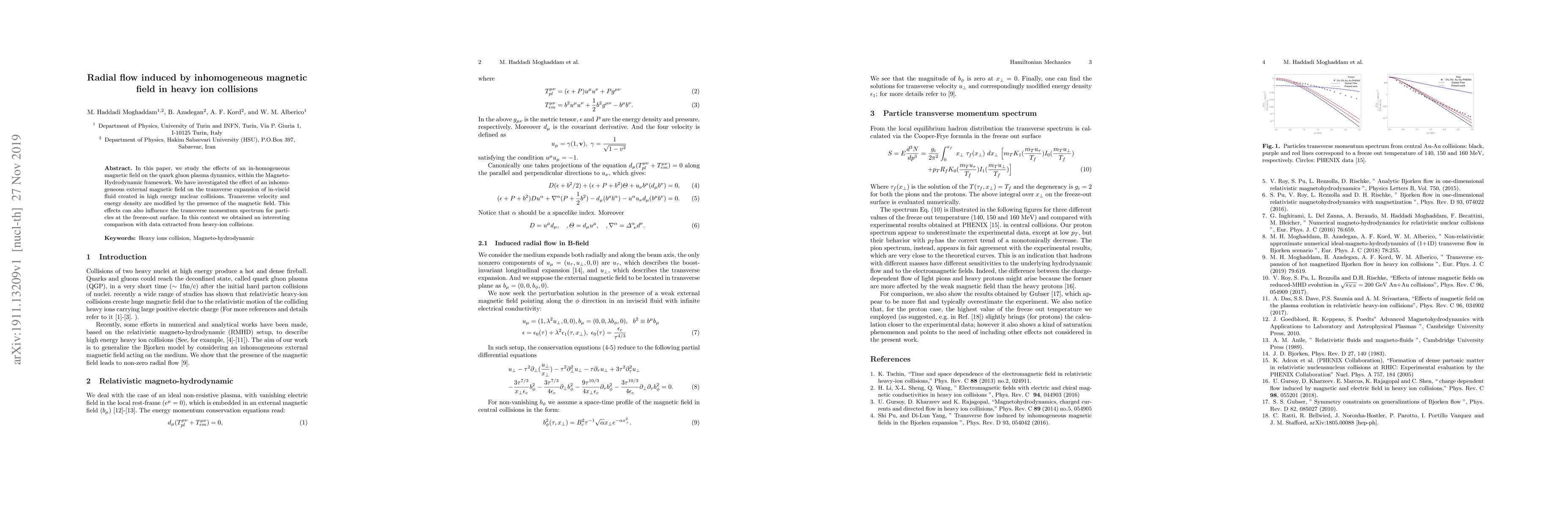 In this paper, we study the effects of an in-homogeneous magnetic field on the quark gluon plasma dynamics, within the Magneto-Hydrodynamic framework. We have investigated the effect of an inhomogeneous external magnetic field on the transverse expansion of in-viscid fluid created in high energy nuclear collisions. Transverse velocity and energy density are modified by the presence of the magnetic field. This effects can also influence the transverse momentum spectrum for particles at the freeze-out surface. In this context we obtained an interesting comparison with data extracted from heavy-ion collisions.