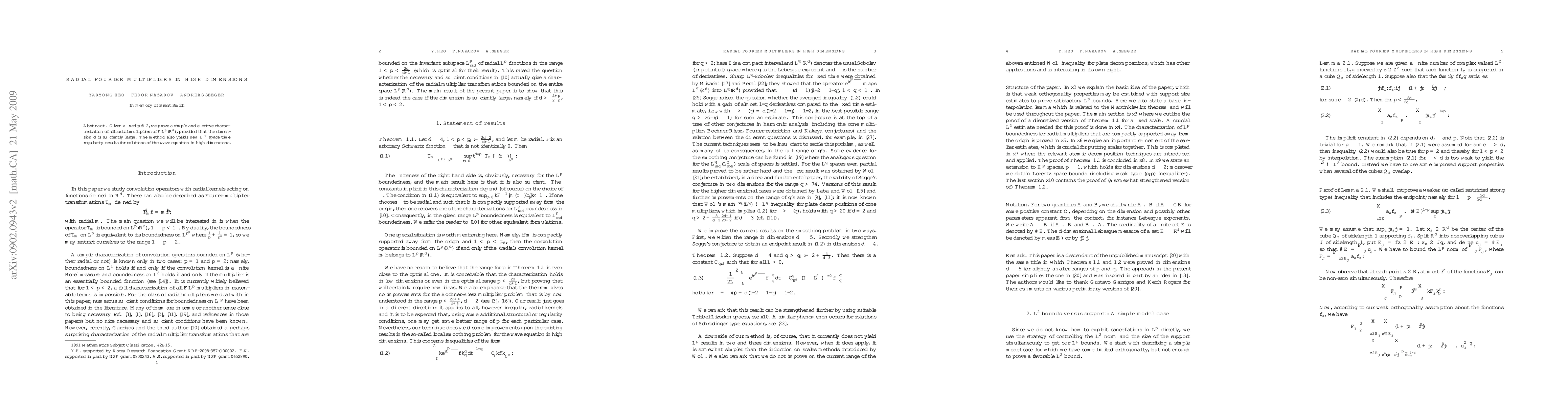 Given a fixed $p\neq 2$, we prove a simple and effective characterization of all radial multipliers of $\cF L^p(\Bbb R^d)$, provided that the dimension $d$ is sufficiently large. The method also yields new $L^q$ space-time regularity results for solutions of the wave equation in high dimensions.