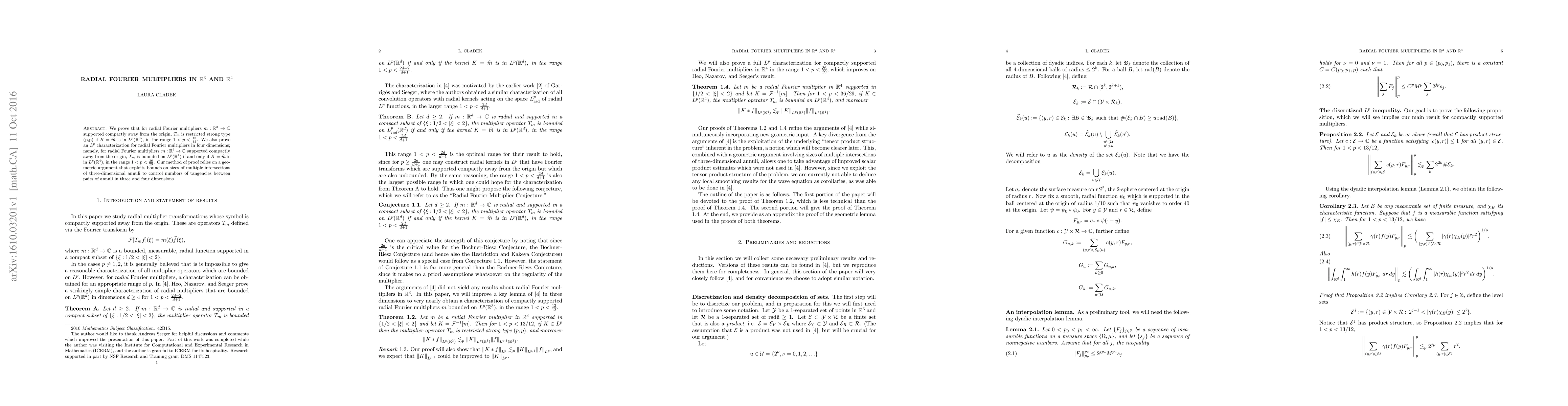 This paper proves that radial Fourier multipliers in $\mathbb{R}^3$ are restricted strong type $(p,p)$ when their Fourier transforms are in $L^p$ for $1<p<\frac{13}{12}$. It also establishes an $L^p$ characterization for radial Fourier multipliers in $\mathbb{R}^4$ in the range $1<p<\frac{36}{29}$. The proofs utilize geometric arguments involving intersections of annuli.