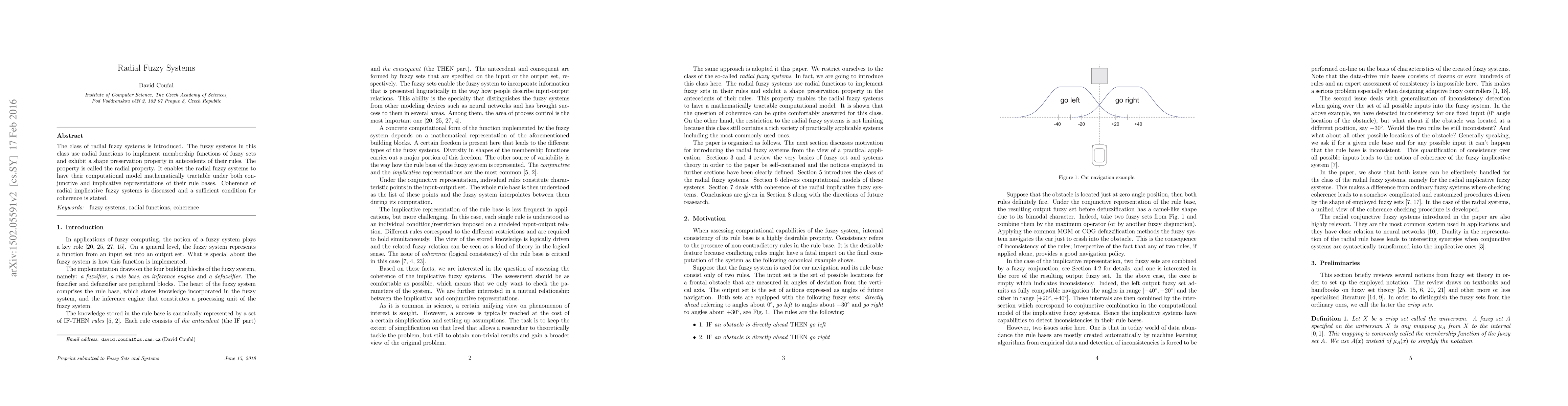 The class of radial fuzzy systems is introduced. The fuzzy systems in this class use radial functions to implement membership functions of fuzzy sets and exhibit a shape preservation property in antecedents of their rules. The property is called the radial property. It enables the radial fuzzy systems to have their computational model mathematically tractable under both conjunctive and implicative representations of their rule bases. Coherence of radial implicative fuzzy systems is discussed and a sufficient condition for coherence is stated.