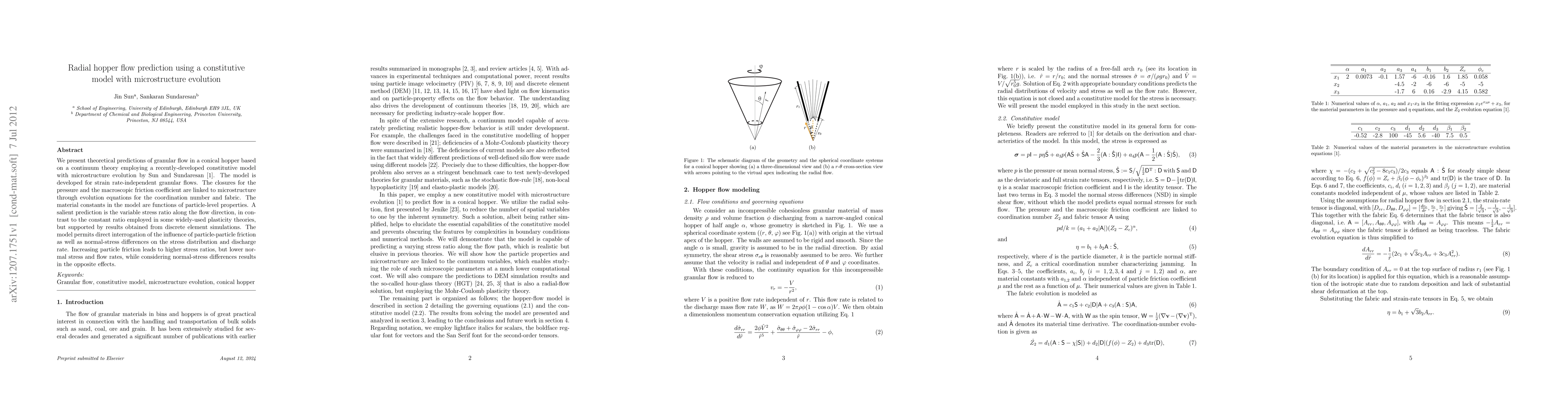 We present theoretical predictions of granular flow in a conical hopper based on a continuum theory employing a recently-developed constitutive model with microstructure evolution by Sun and Sundaresan [1]. The model is developed for strain rate-independent granular flows. The closures for the pressure and the macroscopic friction coefficient are linked to microstructure through evolution equations for the coordination number and fabric. The material constants in the model are functions of particle-level properties. A salient prediction is the variable stress ratio along the flow direction, in contrast to the constant ratio employed in some widely-used plasticity theories, but supported by results obtained from discrete element simulations. The model permits direct interrogation of the influence of particle-particle friction as well as normal-stress differences on the stress distribution and discharge rate. Increasing particle friction leads to higher stress ratios, but lower normal stress and flow rates, while considering normal-stress differences results in the opposite effects.