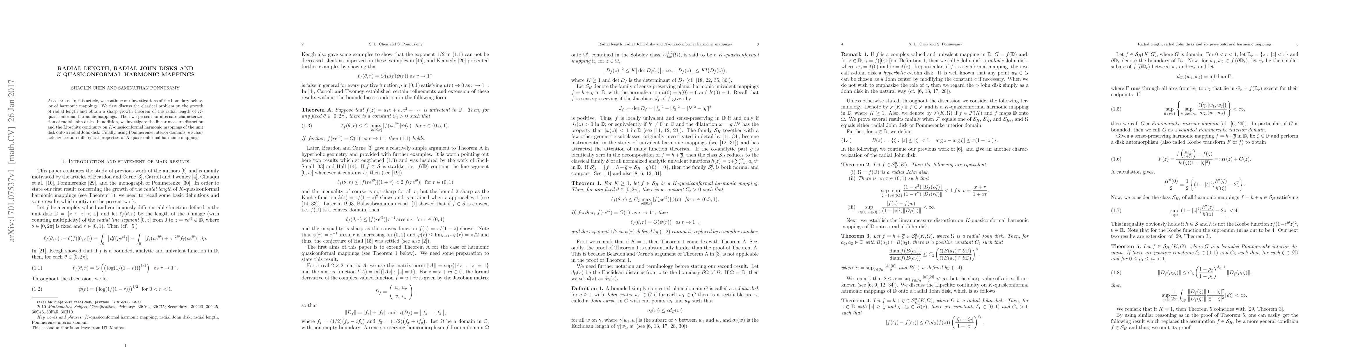 In this article, we continue our investigations of the boundary behavior of harmonic mappings. We first discuss the classical problem on the growth of radial length and obtain a sharp growth theorem of the radial length of $K$-quasiconformal harmonic mappings. Then we present an alternate characterization of radial John disks. In addition, we investigate the linear measure distortion and the Lipschitz continuity on $K$-quasiconformal harmonic mappings of the unit disk onto a radial John disk. Finally, using Pommerenke interior domains, we characterize certain differential properties of $K$-quasiconformal harmonic mappings.