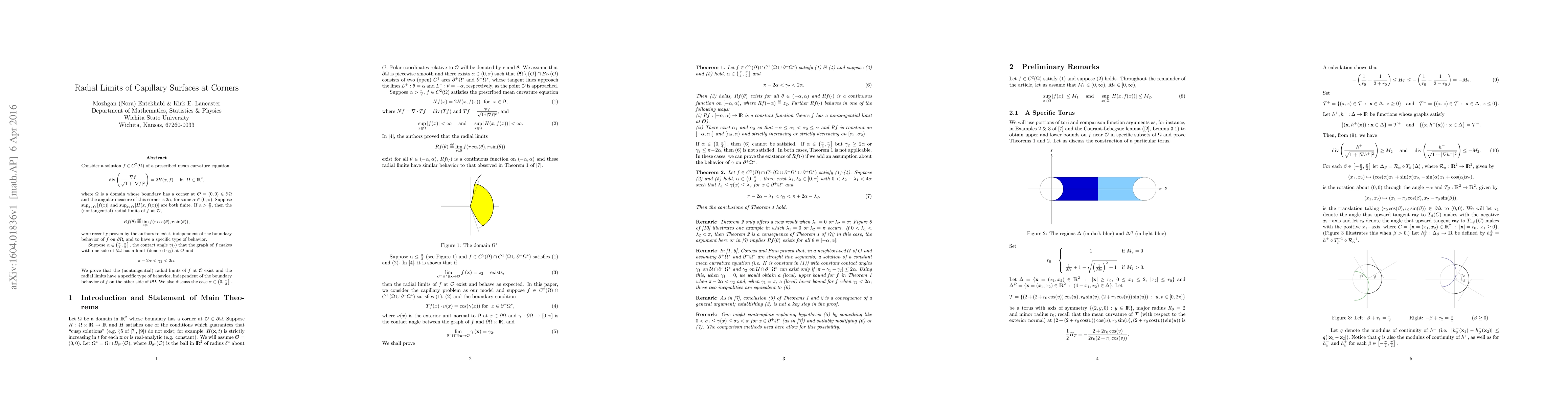 Consider a solution $f\in C^{2}(\Omega)$ of a prescribed mean curvature equation \[ {\rm div}\left(\frac{\nabla f}{\sqrt{1+|\nabla f|^{2}}}\right)=2H(x,f) \ \ \ \ {\rm in} \ \ \Omega\subset R^{2}, \] where $\Omega$ is a domain whose boundary has a corner at ${\cal O}=(0,0)\in\partial\Omega$ and the angular measure of this corner is $2\alpha,$ for some $\alpha\in (0,\pi).$ Suppose $\sup_{x\in\Omega} |f(x)|$ and $\sup_{x\in\Omega} |H(x,f(x))|$ are both finite. If $\alpha>\frac{\pi}{2},$ then the (nontangential) radial limits of $f$ at ${\cal O},$ \[ Rf(\theta) = \lim_{r\downarrow 0} f(r\cos(\theta),r\sin(\theta)), \] were recently proven by the authors to exist, independent of the boundary behavior of $f$ on $\partial\Omega,$ and to have a specific type of behavior. Suppose $\alpha\in \left(\frac{\pi}{4},\frac{\pi}{2}\right],$ the contact angle $\gamma(\cdot)$ that the graph of $f$ makes with one side of $\partial\Omega$ has a limit (denoted $\gamma_{2}$) at ${\cal O}$ and \[ \pi-2\alpha < \gamma_{2} <2\alpha. \] We prove that the (nontangential) radial limits of $f$ at ${\cal O}$ exist and the radial limits have a specific type of behavior, independent of the boundary behavior of $f$ on the other side of $\partial\Omega.$ We also discuss the case $\alpha\in \left(0,\frac{\pi}{2}\right].$