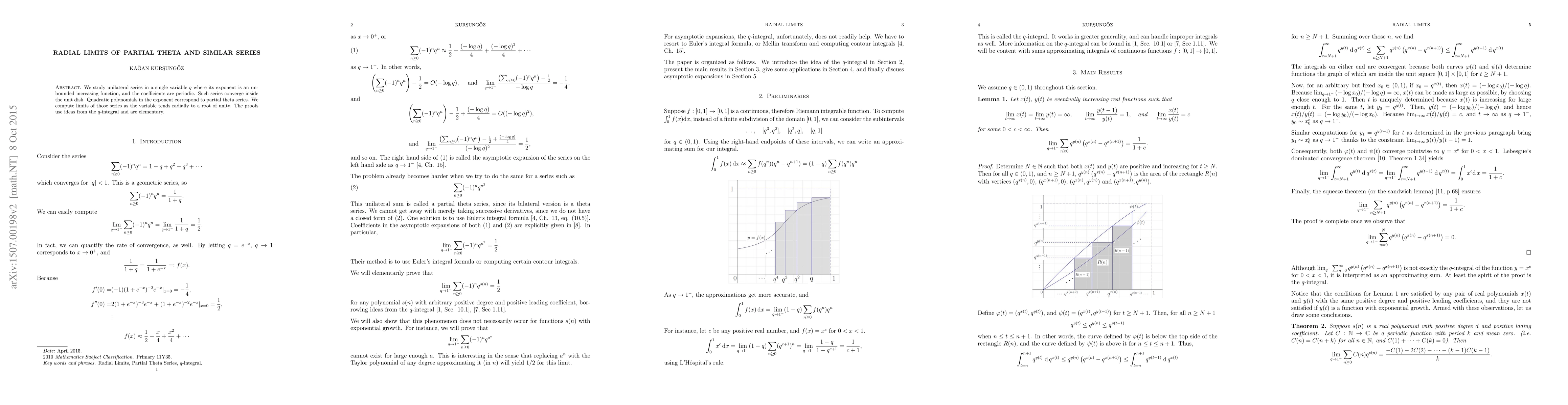 We study unilateral series in a single variable $q$ where its exponent is an unbounded increasing function, and the coefficients are periodic. Such series converge inside the unit disk. Quadratic polynomials in the exponent correspond to partial theta series. We compute limits of those series as the variable tends radially to a root of unity. The proofs use ideas from the $q$-integral and are elementary.