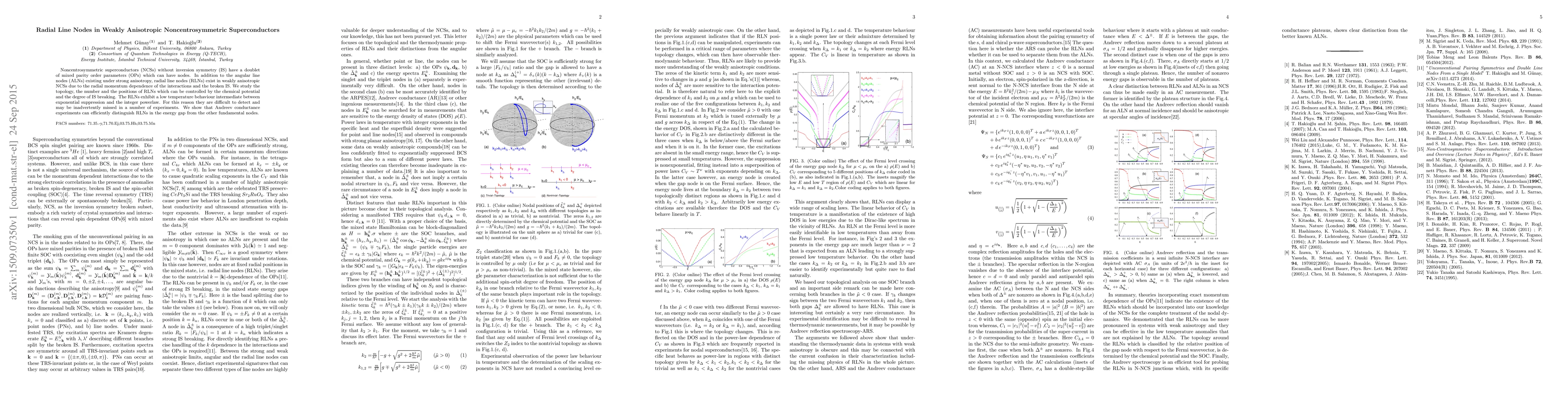 This paper investigates radial line nodes (RLNs) in weakly anisotropic noncentrosymmetric superconductors, revealing their unique topological properties and positions controlled by chemical potential and inversion symmetry breaking. RLNs are challenging to detect due to their intermediate suppression behavior, but Andreev conductance experiments can effectively distinguish them from other nodes.