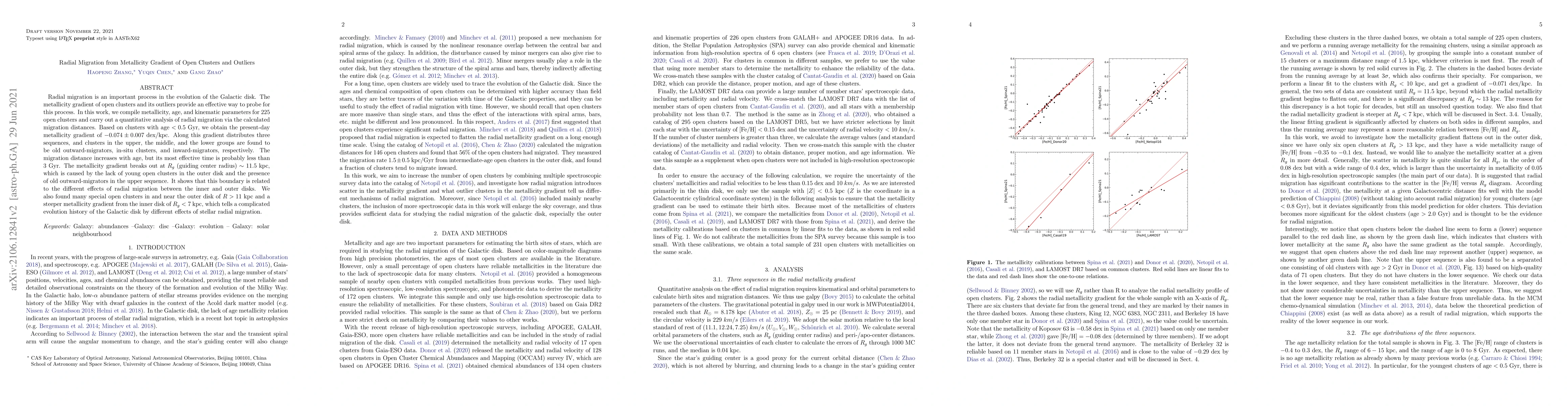 This paper investigates radial migration in the Galactic disk using metallicity gradients of 225 open clusters, finding a present-day gradient of $-0.074 \pm 0.007$ dex/kpc. It reveals three cluster sequences indicating different migration behaviors: old outward-migrators, in-situ clusters, and inward-migrators.