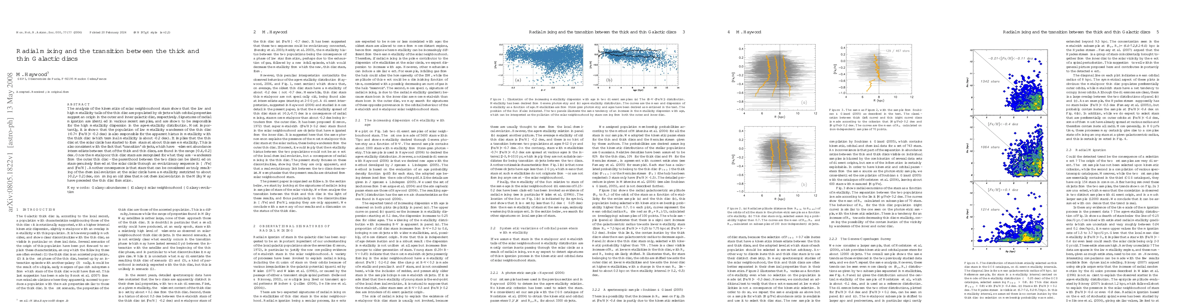 This paper investigates the radial mixing of stars in the Milky Way, revealing that the transition between the thick and thin Galactic discs is marked by low metallicity stars originating from the outer disc. The study identifies radial migration as the cause of high metallicity dispersion and explains the hiatus in metallicity between the thin and thick discs, suggesting that most chemical evolution occurred before the thin disc's formation.