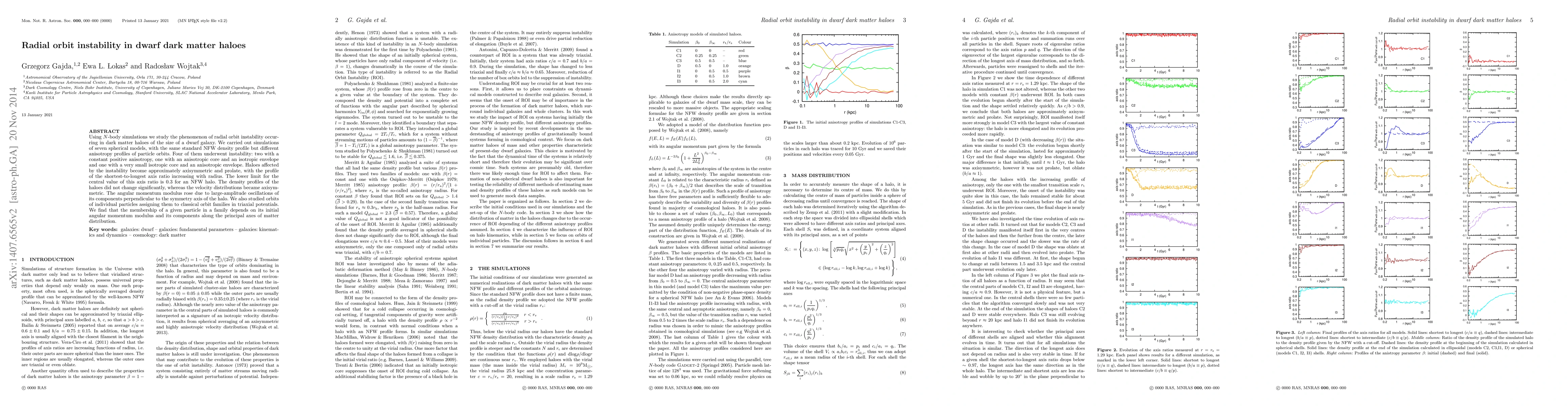 This paper investigates radial orbit instability in dwarf dark matter haloes using N-body simulations, revealing that four out of seven models undergo instability, leading to axisymmetric and prolate shapes. The study finds that while density profiles remain largely unchanged, the velocity distributions and angular momentum become axisymmetric.