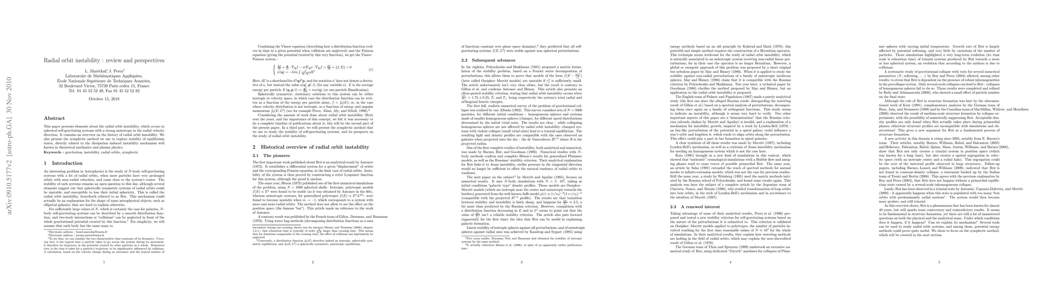 This paper presents elements about the radial orbit instability, which occurs in spherical self-gravitating systems with a strong anisotropy in the radial velocity direction. It contains an overview on the history of radial orbit instability. We also present the symplectic method we use to explore stability of equilibrium states, directly related to the dissipation induced instability mechanism well known in theoretical mechanics and plasma physics.