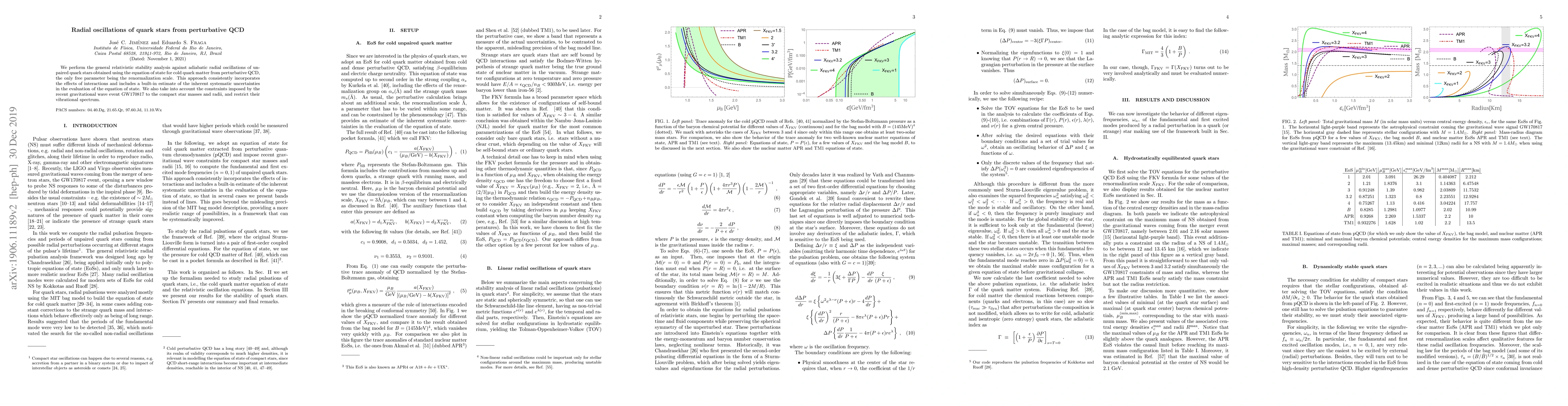 This paper analyzes the radial oscillations of quark stars using a perturbative QCD equation of state, incorporating interaction effects and systematic uncertainties. It also considers constraints from gravitational wave event GW 170817 to refine the stars' mass, radius, and vibrational spectrum.