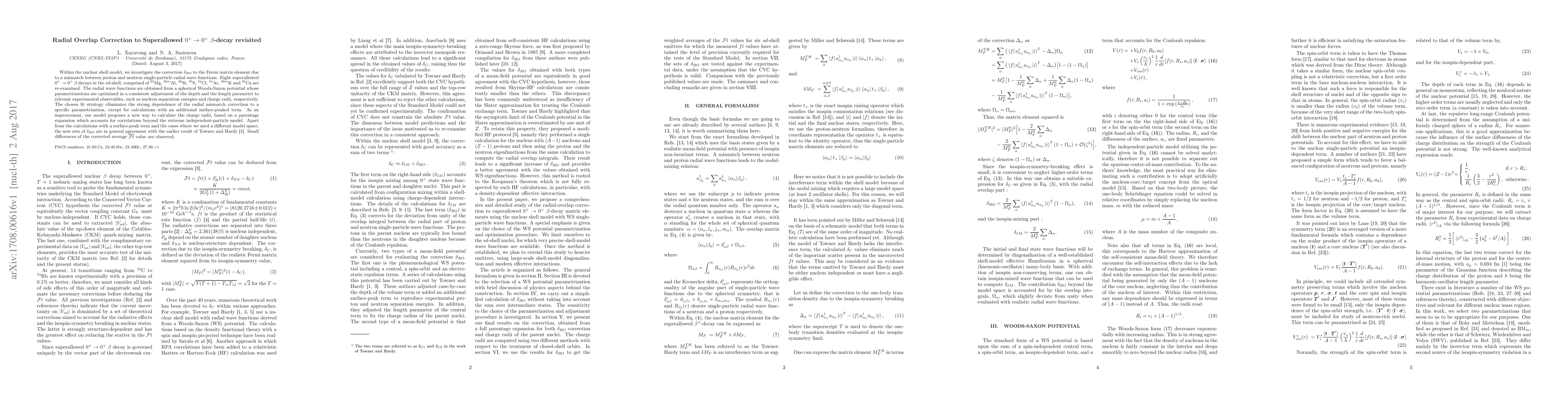 Within the nuclear shell model, we investigate the correction $\delta_{RO}$ to the Fermi matrix element due to a mismatch between proton and neutron single-particle radial wave functions. Eight superallowed $0^+ \to 0^+$ $\beta$ decays in the $sd$-shell, comprised of $^{22}$Mg, $^{26m}$Al, $^{26}$Si, $^{30}$S, $^{34}$Cl, $^{34}$Ar, $^{38m}$K and $^{38}$Ca are re-examined. The radial wave functions are obtained from a spherical Woods-Saxon potential whose parametrizations are optimized in a consistent adjustment of the depth and the length parameter to relevant experimental observables, such as nucleon separation energies and charge radii, respectively. The chosen fit strategy eliminates the strong dependence of the radial mismatch correction to a specific parametrization, except for calculations with an additional surface-peaked term. As an improvement, our model proposes a new way to calculate the charge radii, based on a parentage expansion which accounts for correlations beyond the extreme independent-particle model. Apart from the calculations with a surface-peak term and the cases where we used a different model space, the new sets of $\delta_{RO}$ are in general agreement with the earlier result of Towner and Hardy [1]. Small differences of the corrected average $\overline{\mathcal{F}t}$ value are observed.