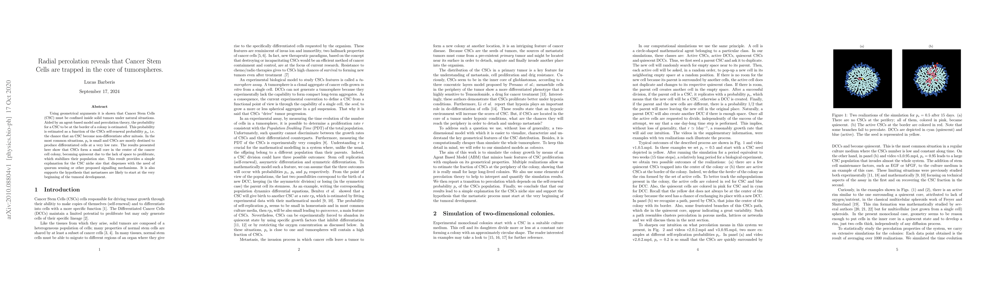 This research demonstrates that Cancer Stem Cells (CSCs) are trapped in the core of tumorspheres due to radial percolation, leading to their quiescence and low differentiation rate. The findings suggest that CSCs naturally form a small core, explaining their niche size without requiring complex signaling mechanisms.