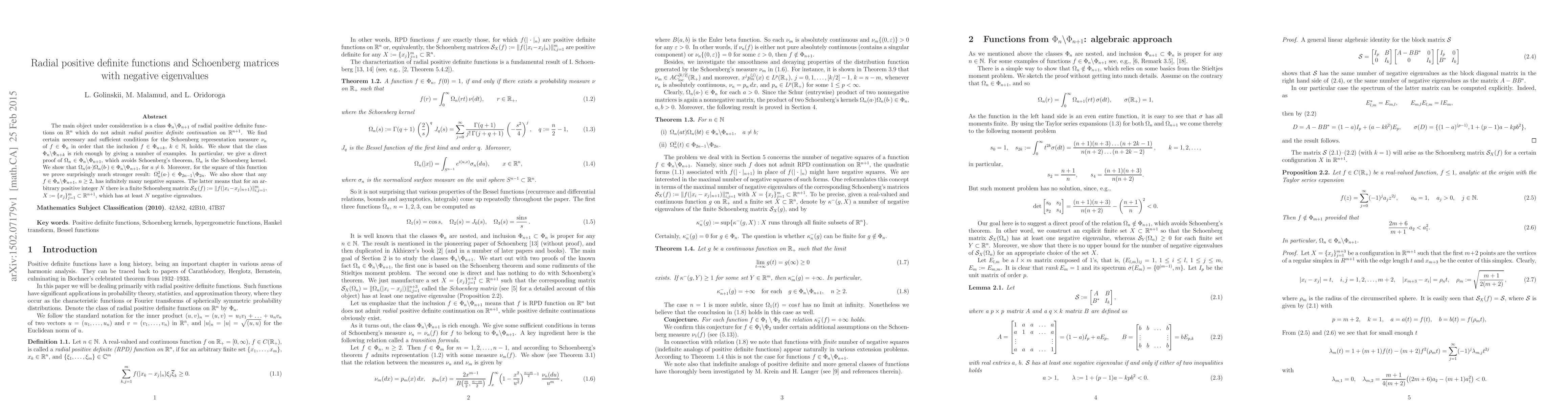 This paper explores radial positive definite functions that cannot be extended radially in higher dimensions, focusing on the class $\Phi_n\backslash\Phi_{n+1}$. It provides conditions for the Schoenberg representation measure $\nu_n$ and demonstrates that functions in this class can have infinitely many negative squares, leading to Schoenberg matrices with negative eigenvalues.