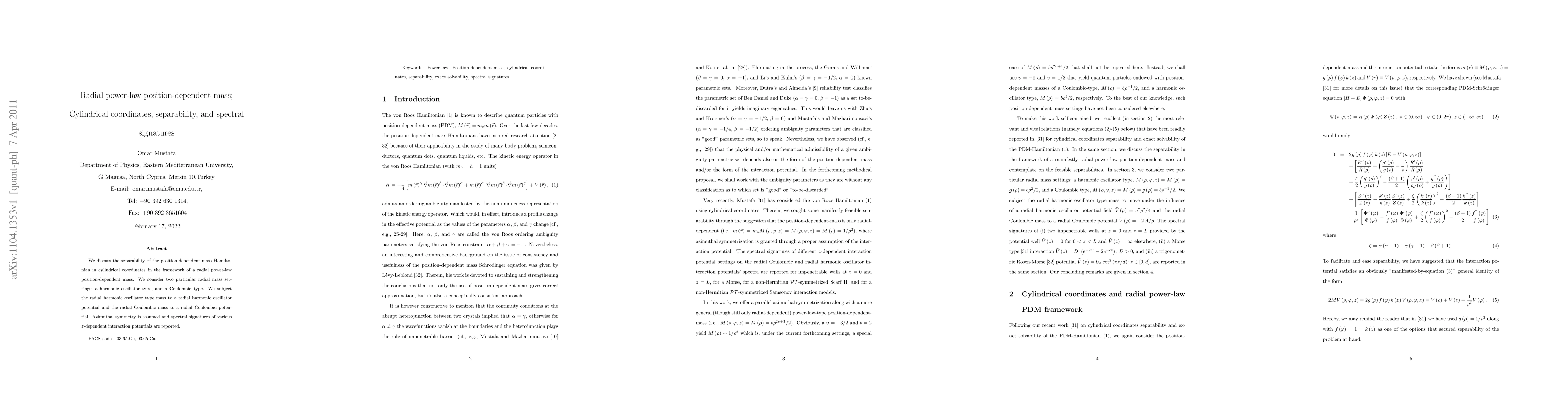 This paper explores the separability of a position-dependent mass Hamiltonian in cylindrical coordinates for radial power-law masses, specifically examining harmonic oscillator and Coulombic types. Spectral signatures of z-dependent interaction potentials under azimuthal symmetry are analyzed.