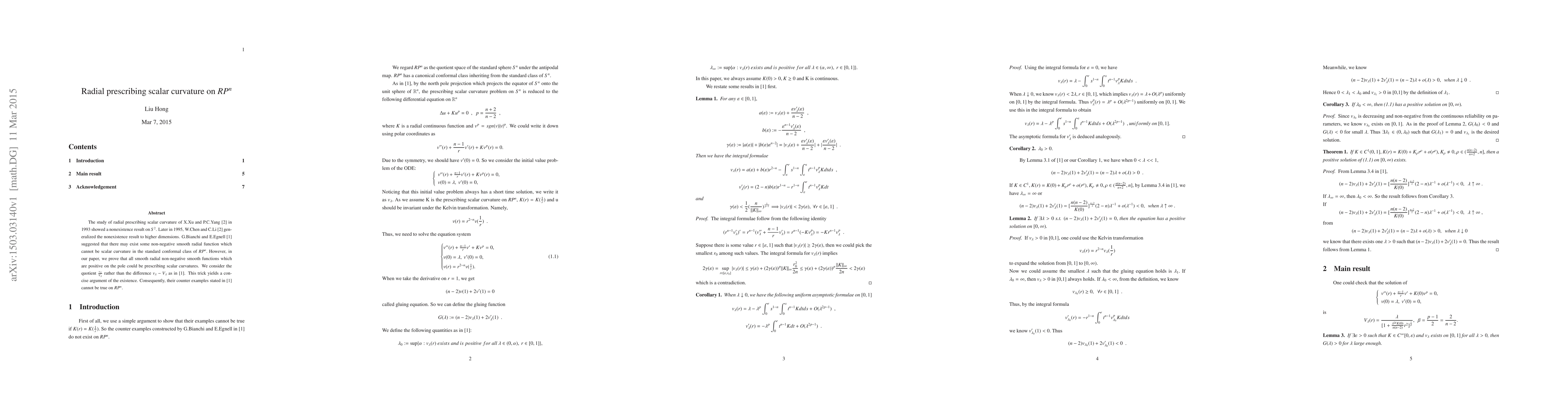 This paper proves that all smooth radial non-negative functions positive at the pole can be scalar curvatures on $RP^n$, contrasting previous counterexamples suggesting otherwise. The authors use the quotient $\frac{v_\lambda}{V_\lambda}$ instead of their difference to provide a concise existence argument.