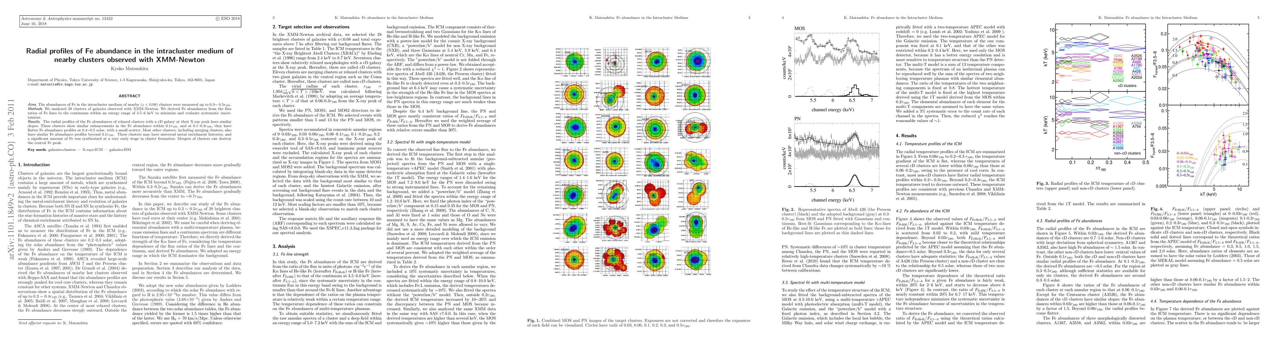This study measures the radial profiles of Fe abundance in the intracluster medium of nearby galaxy clusters using XMM-Newton data, revealing similar Fe abundance slopes and enhancements in relaxed clusters, suggesting universal metal enrichment histories and early Fe synthesis. Mergers disrupt central Fe peaks.