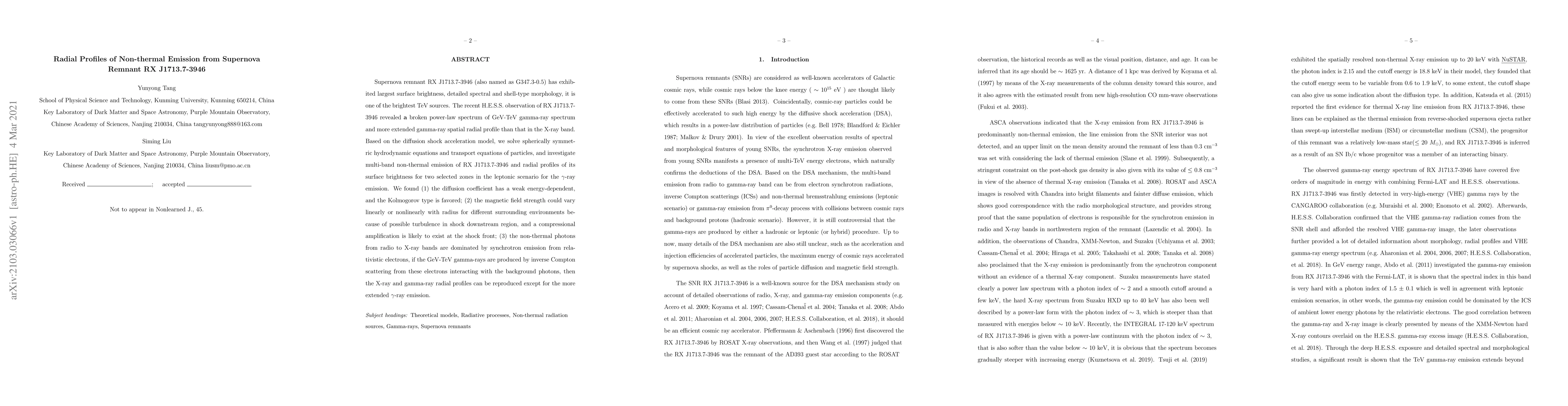 The research presents a detailed analysis of radial profiles of non-thermal emission from RX J1713.7-3946, providing insights into the diffusion coefficient, magnetic field strength, and their dependence on energy and position.