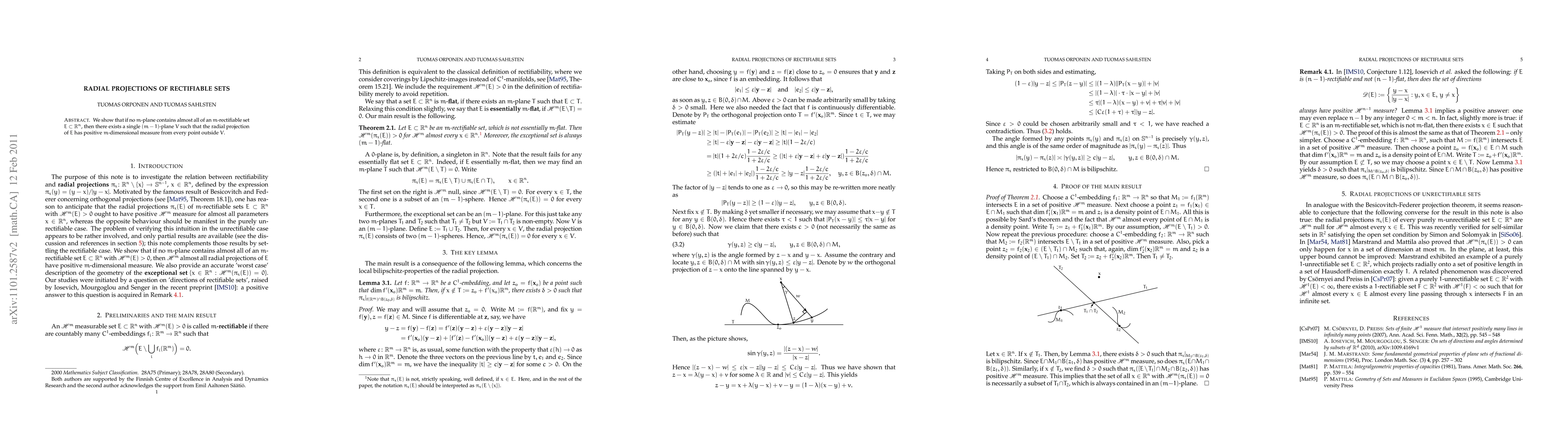 We show that if no $m$-plane contains almost all of an $m$-rectifiable set $E \subset \R^{n}$, then there exists a single $(m - 1)$-plane $V$ such that the radial projection of $E$ has positive $m$-dimensional measure from every point outside $V$.