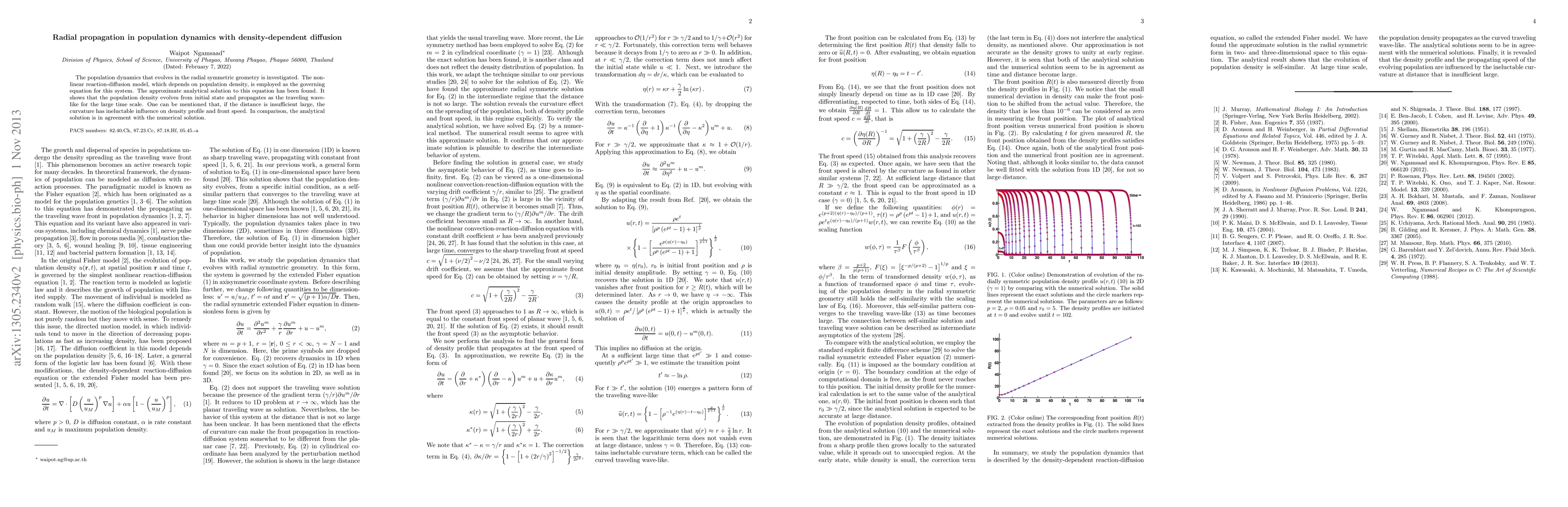 This paper investigates radial population dynamics using a density-dependent diffusion model, finding an approximate analytical solution that reveals traveling wave-like density propagation. The curvature significantly affects density profiles and front speeds when distances are not excessively large, with analytical results matching numerical simulations.