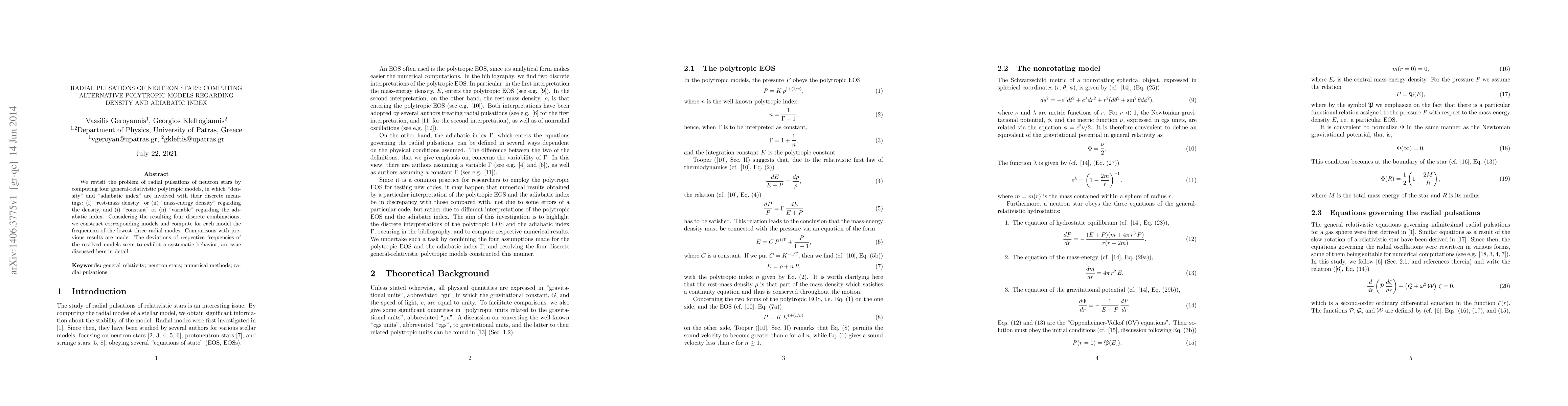 We revisit the problem of radial pulsations of neutron stars by computing four general-relativistic polytropic models, in which "density" and "adiabatic index" are involved with their discrete meanings: (i) "rest-mass density" or (ii) "mass-energy density" regarding the density, and (i) "constant" or (ii) "variable" regarding the adiabatic index. Considering the resulting four discrete combinations, we construct corresponding models and compute for each model the frequencies of the lowest three radial modes. Comparisons with previous results are made. The deviations of respective frequencies of the resolved models seem to exhibit a systematic behavior, an issue discussed here in detail.