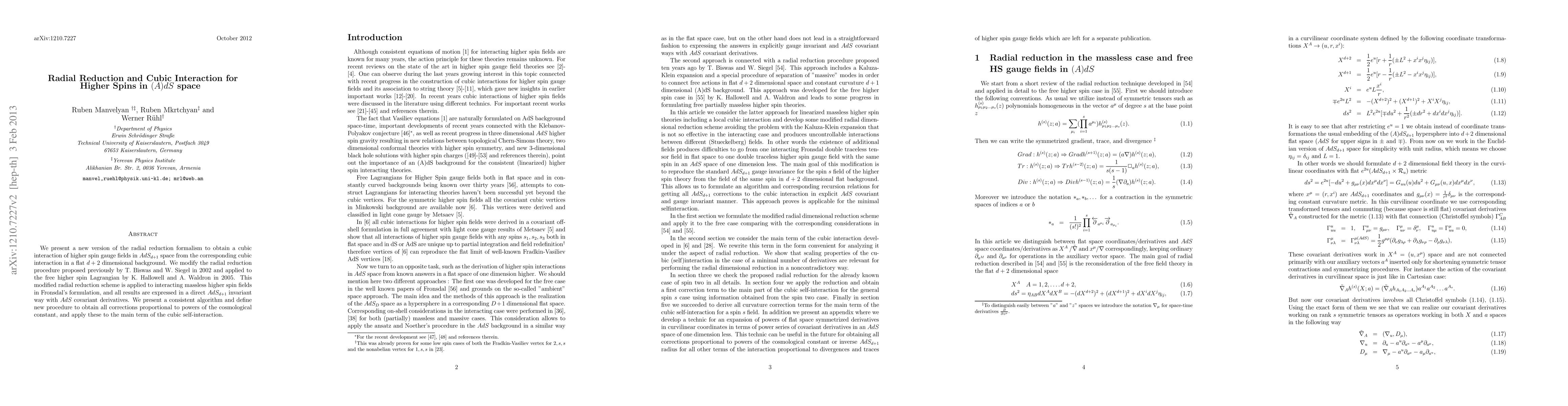 This paper introduces a refined radial reduction formalism to derive cubic interactions for higher spin gauge fields in $AdS_{d+1}$ space from flat space, modifying a previous method. The new approach consistently computes corrections proportional to the cosmological constant and applies it to the cubic self-interaction of massless higher spin fields.
