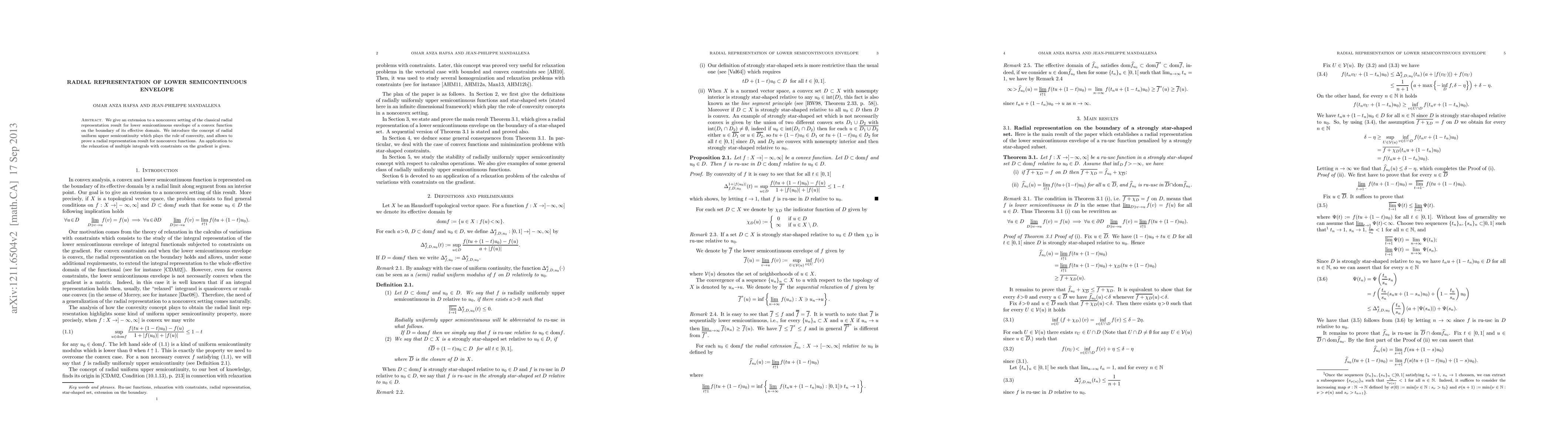 This paper extends the classical radial representation for the lower semicontinuous envelope of convex functions to a nonconvex setting using the concept of radial uniform upper semicontinuity. An application to the relaxation of multiple integrals with gradient constraints is also presented.