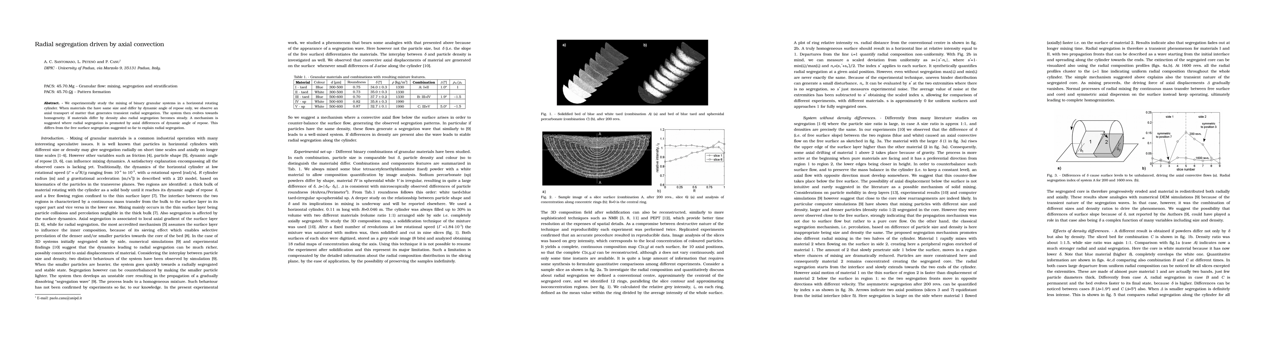 This study experimentally investigates the mixing of binary granular systems in a rotating cylinder, revealing that axial convection driven by differences in dynamic angle of repose leads to transient radial segregation, which eventually evolves towards homogeneity. When density differences are also present, radial segregation becomes steady.